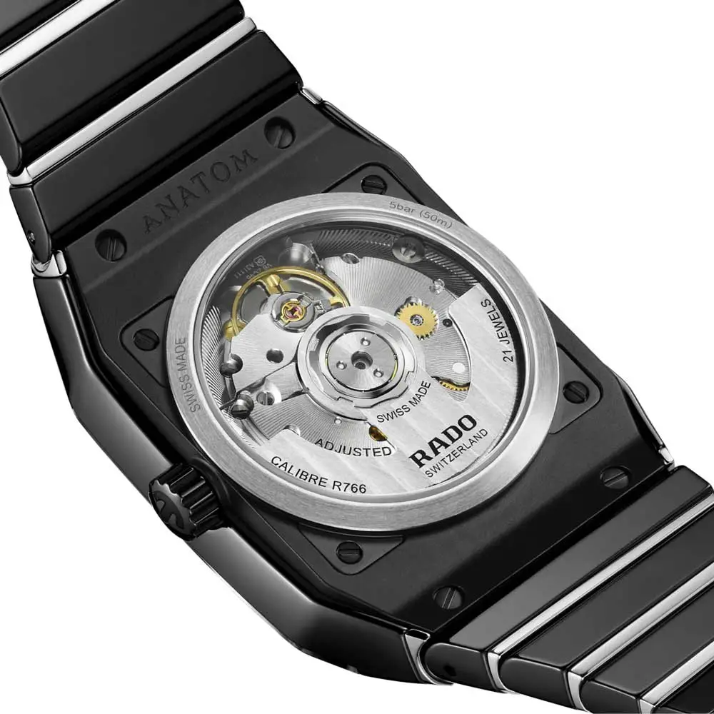 Uvnitř tiká precizní švýcarský automatický strojek Rado R766 (na bázi ETA 2892-A2) s rezervou chodu až 72 hodin. Transparentní zadní víko umožňuje nahlédnout do detailního zpracování tohoto spolehlivého mechanismu.