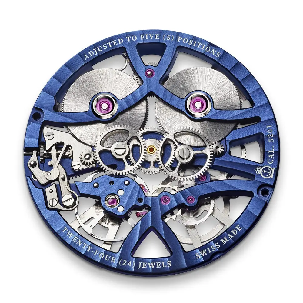 Uvnitř pracuje manufakturní ručně natahovaný kalibr A&S 5201 s rezervou chodu až 90 hodin, který je dekorován modře PVD povrchovanými mosty a rhodiovanými komponenty pro kontrastní hloubku. Strojek zobrazuje centrální hodiny a minuty, malé vteřiny na pozici 7. hodiny a odhaluje mimořádnou souměrnost v duchu vysokého hodinářského umění.