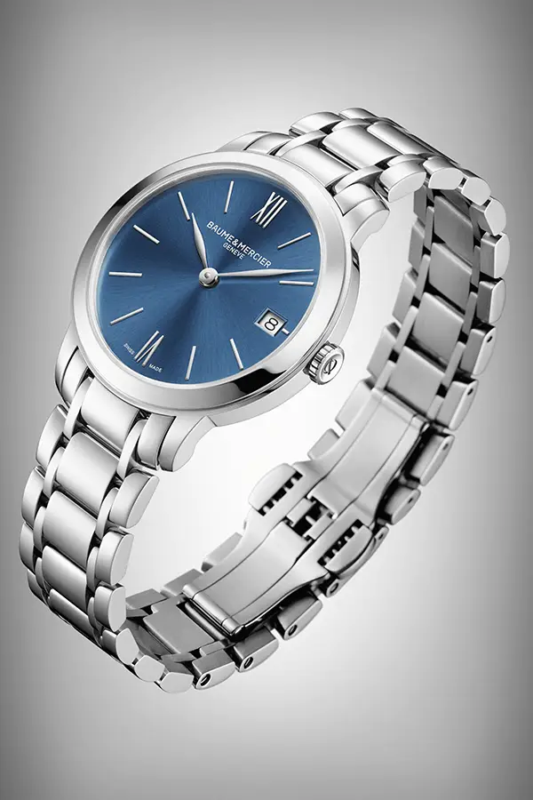 Hodinky v modelové řadě Baume & Mercier Classima nechávají vyniknout luxusním materiálům a preciznímu zpracování. Nápadné a složité detaily nejsou třeba, modrý ciferník zaujme přehledným a stylově čistým řešením. Zobrazuje přesný čas a datumovku, je usazený ve stříbrném pouzdře, na které navazuje stejně laděný pásek z drobných článků. Hodinky působí jako dokonalý nadčasový elegantní základ