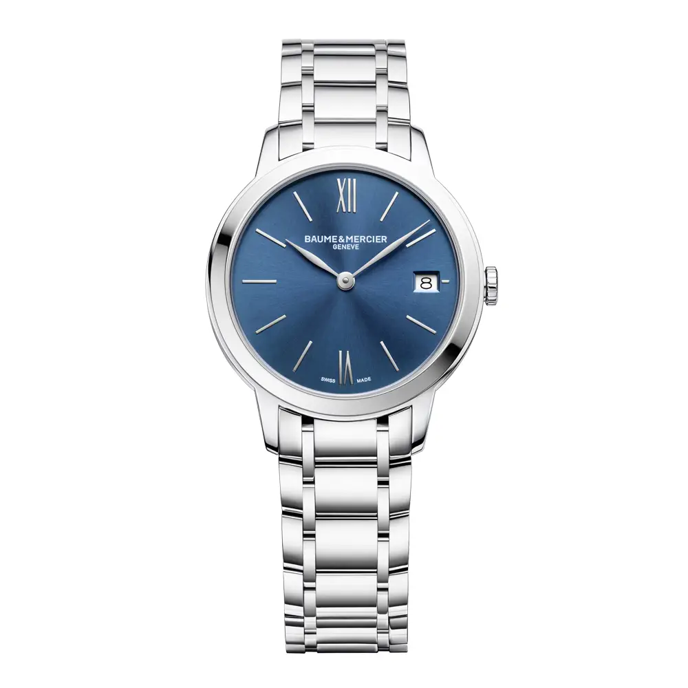 Baume & Mercier Classima Lady M0A10477 představuje esenci ženské elegance a švýcarské preciznosti. Pouzdro z nerezové oceli o průměru 31 mm doplňuje modrý sluneční číselník s jemnou texturou, římskými číslicemi a datumovým okénkem na 3. hodině. Tento decentní, ale výrazný design podtrhuje nadčasový charakter kolekce Classima.