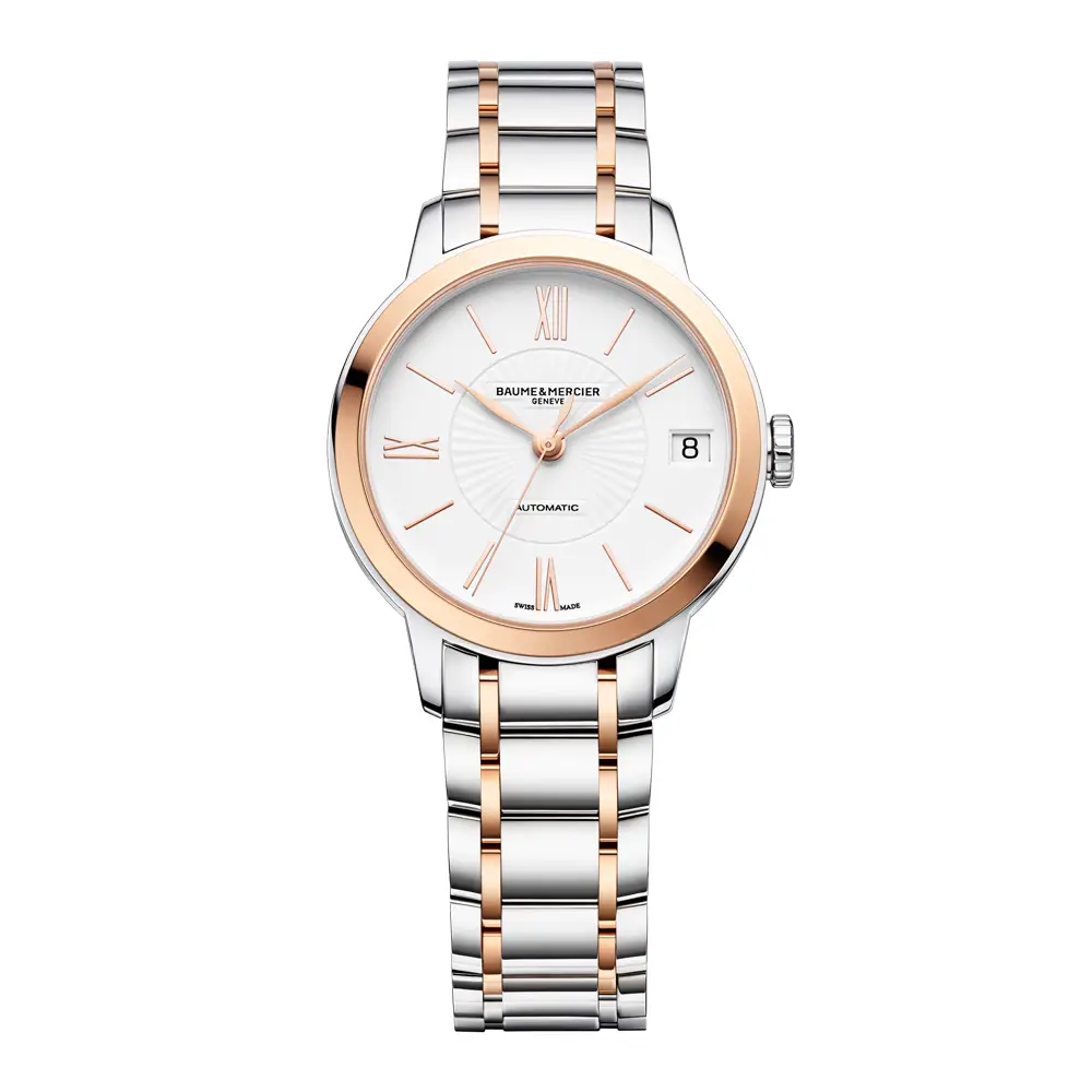 Baume & Mercier Classima M0A10269 ztělesňuje nadčasovou eleganci a jemný ženský styl. Pouzdro z nerezové oceli o průměru 31 mm doplňuje luneta z 18kt růžového zlata, která dodává hodinkám sofistikovaný kontrast. Bílý číselník s guilloché vzorem a zlatými římskými číslicemi odráží klasický duch kolekce Classima, zatímco decentní datum na 3. hodině podtrhuje praktičnost modelu.