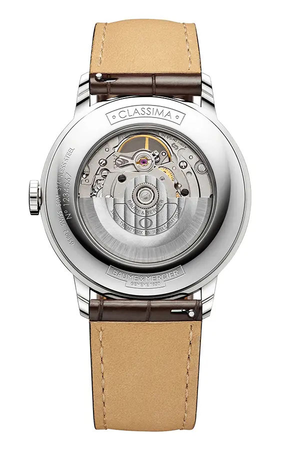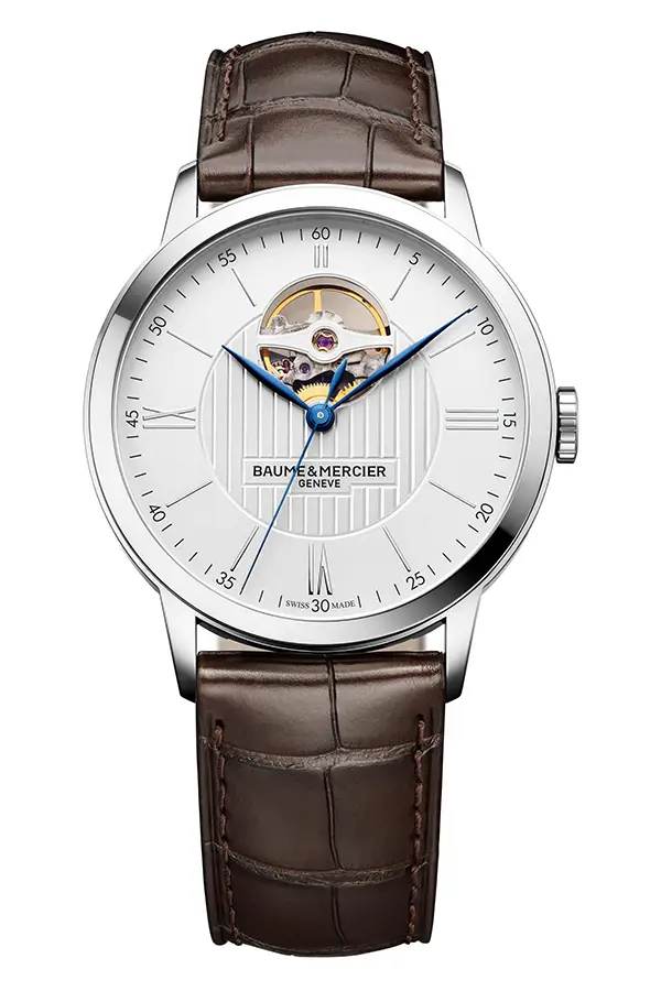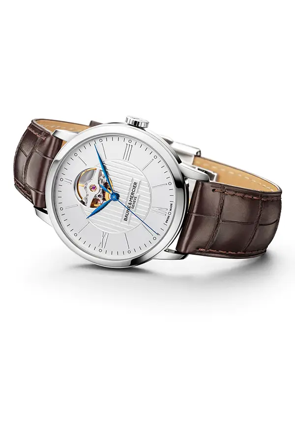 Baume & Mercier nechávají v řadě Classima vyniknout stylově čistému designu. Výběrem a zejména zpracováním luxusních materiálů představují nadčasové a mimořádně elegantní hodinky. Tento model kombinuje kožený hnědý pásek, na kterém je usazené ocelové pouzdro. Atraktivním detailem je odhalený pohled do mechanického strojku hodinek v horní části ciferníku. Bílý ciferník jinak zdobí pouze decentní detaily ve stříbrné, přehledně rozdělují časové úseky, a kromě přesného času upozorní i na aktuální datum.