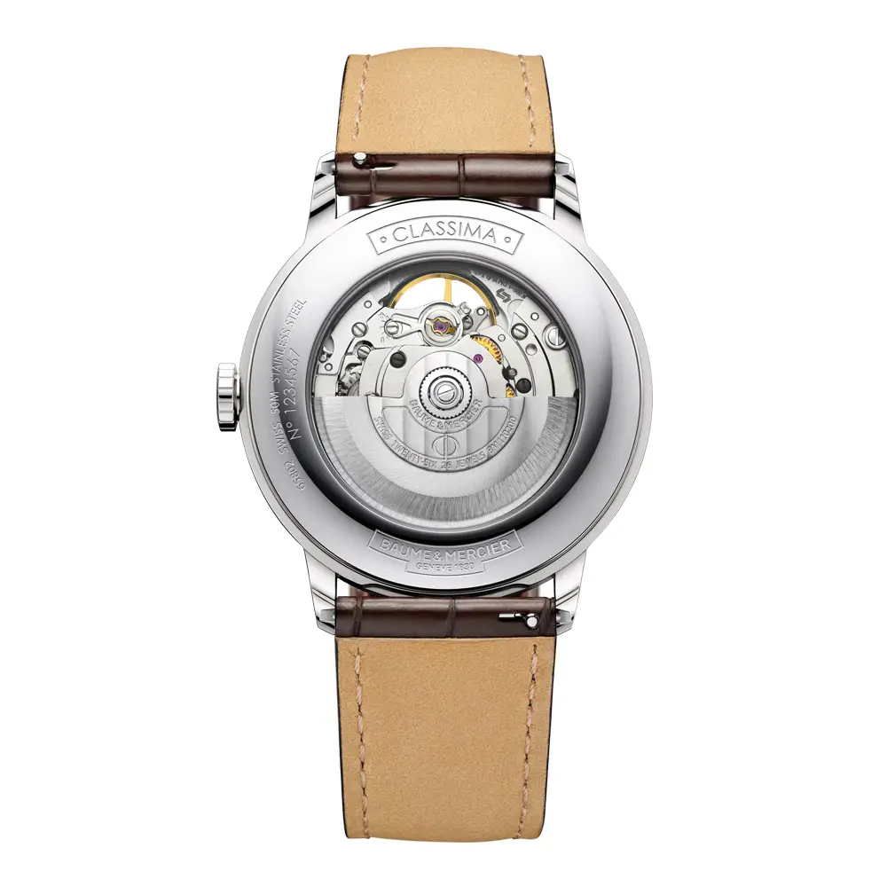 Hodinky vynikají štíhlým profilem a vodotěsností 50 metrů (5 ATM), díky čemuž jsou ideální pro každodenní nošení. Safírové sklíčko chrání číselník před poškrábáním, zatímco průhledné dýnko odhaluje precizní mechanický strojek. Každý detail zdůrazňuje pečlivé řemeslné zpracování a cit pro proporce, typický pro kolekci Classima.