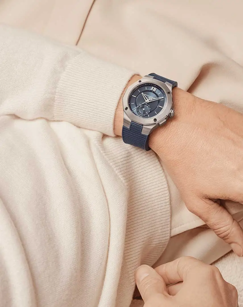 Robustní kulaté pouzdro o průměru 43 mm z ušlechtilé oceli zdobí výrazná dvanáctiúhelníková luneta, typický prvek kolekce Riviera, který podtrhuje osobitý charakter hodinek. Safírové sklíčko chrání elegantní modrý analogový ciferník, jenž zaujme čistým designem a přehledným uspořádáním.