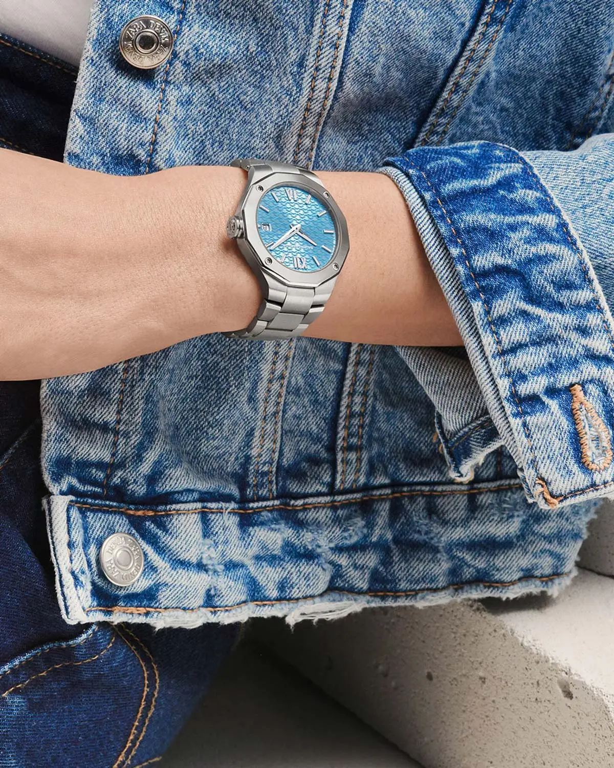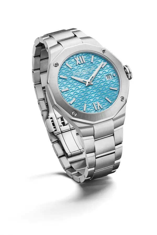 Světle modrý ciferník s jemným vlnovým vzorem evokuje pobřežní krajinu, což hodinkám přidává svěží a letní nádech. Stříbrné ručičky a indexy zajišťují snadnou čitelnost, zatímco římské číslice na pozicích 12 a 6 hodin dodávají ciferníku klasický vzhled. Na pozici 3 hodin se nachází praktický ukazatel data.