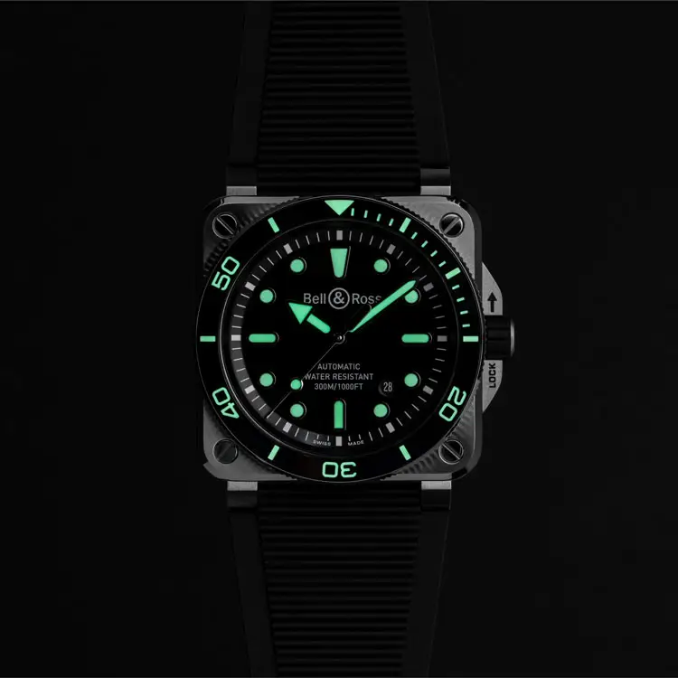 S vodotěsností až 300 metrů (30 ATM) splňuje model BR 03 Diver Black Steel přísnou normu ISO 6425 pro profesionální potápěčské hodinky a obstojí i při hlubokomořském ponoru.