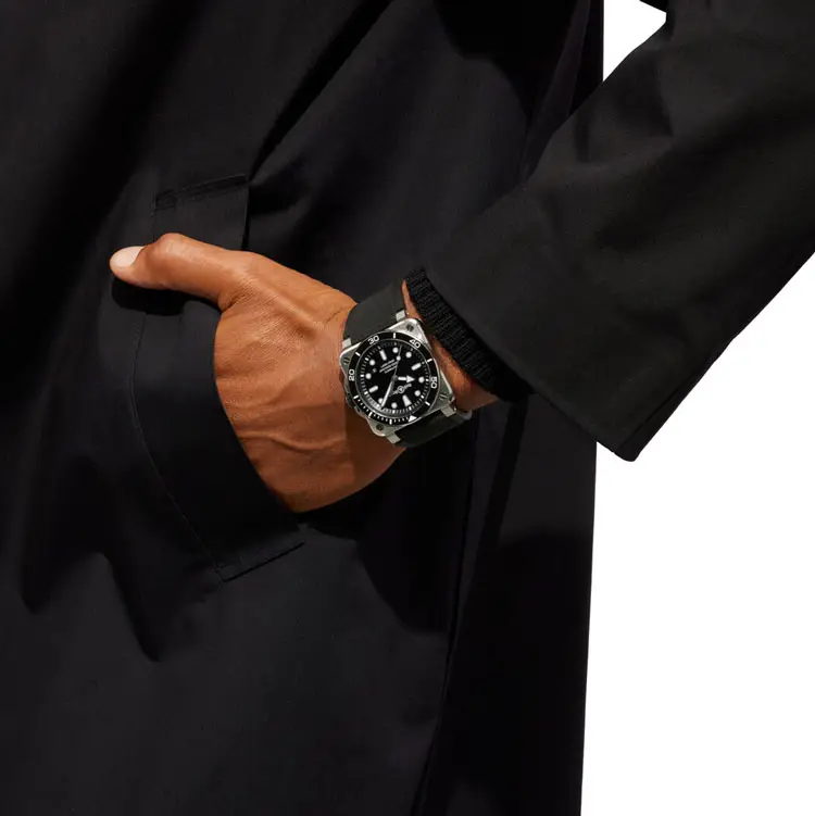 Součástí hodinek je černý kaučukový řemínek s trnovou sponou, který je nejen pohodlný, ale i vysoce odolný vůči vlhkosti, což z něj činí ideální doplněk pro aktivní životní styl – ve vodě i na souši.