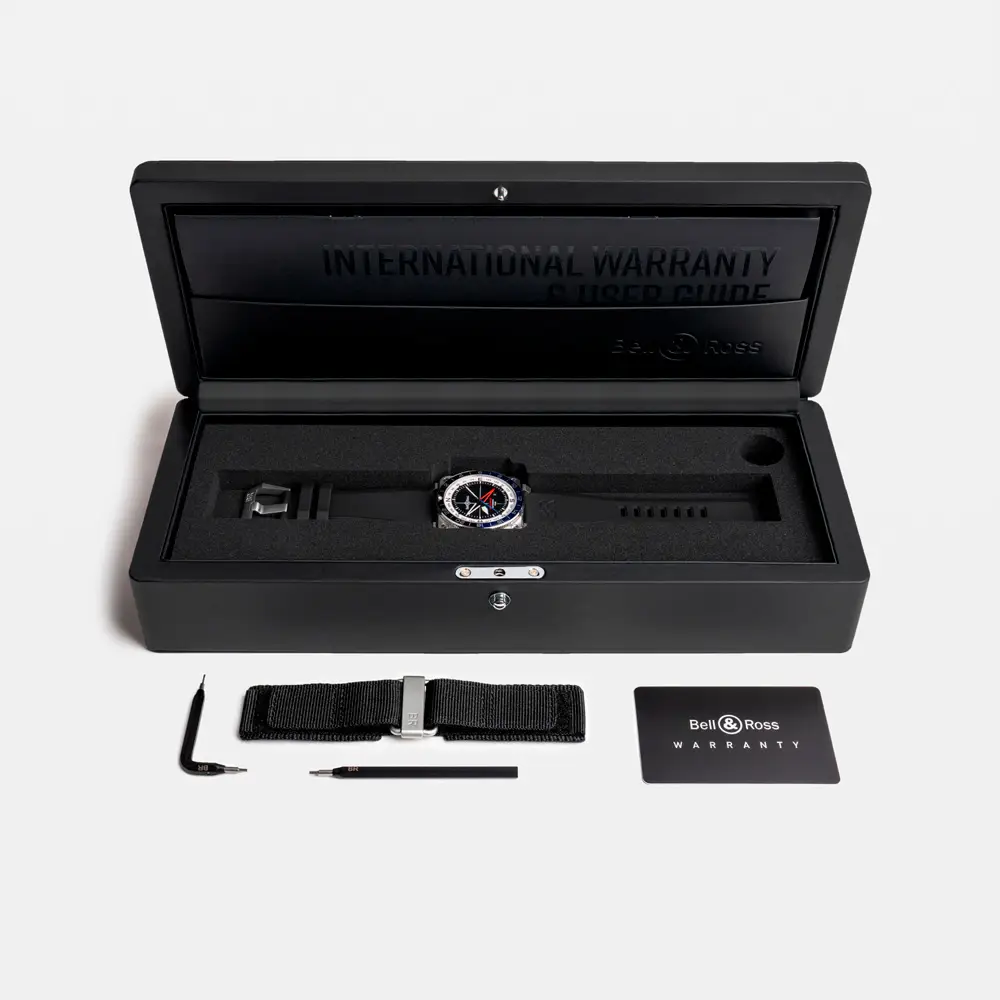 Uvnitř pracuje automatický strojek BR-CAL.303, který zaručuje spolehlivý a přesný chod. Hodinky doplňuje černý pryžový řemínek s ocelovou sponou, jenž zaručuje pohodlí i odolnost. Díky vodotěsnosti 100 m (10 ATM) je model vhodný pro každodenní nošení i cestování. BR 03 GMT Compass je určen pro ty, kteří hledají funkční nástroj s duchem letectví a odvážným stylem.