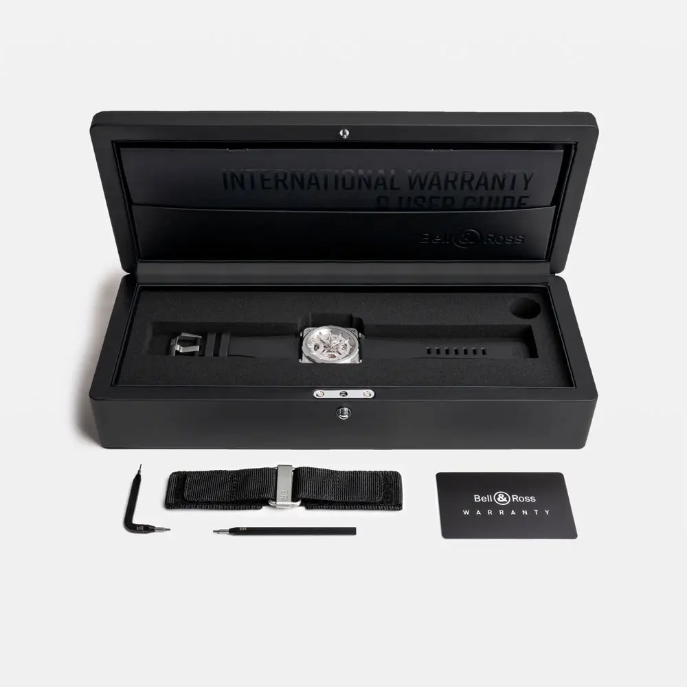 Pouzdro z broušené nerezové oceli o průměru 41 mm ukrývá automatický strojek BR-CAL.322, jehož chod můžete sledovat skrze transparentní skeletonizovaný ciferník s šedými prvky. Každý detail je navržen tak, aby podpořil rovnováhu mezi funkčností a estetikou.