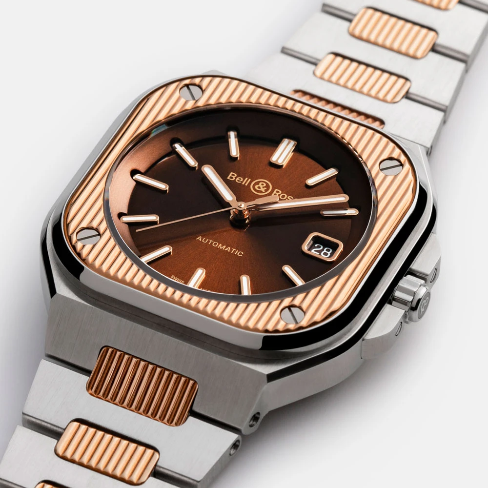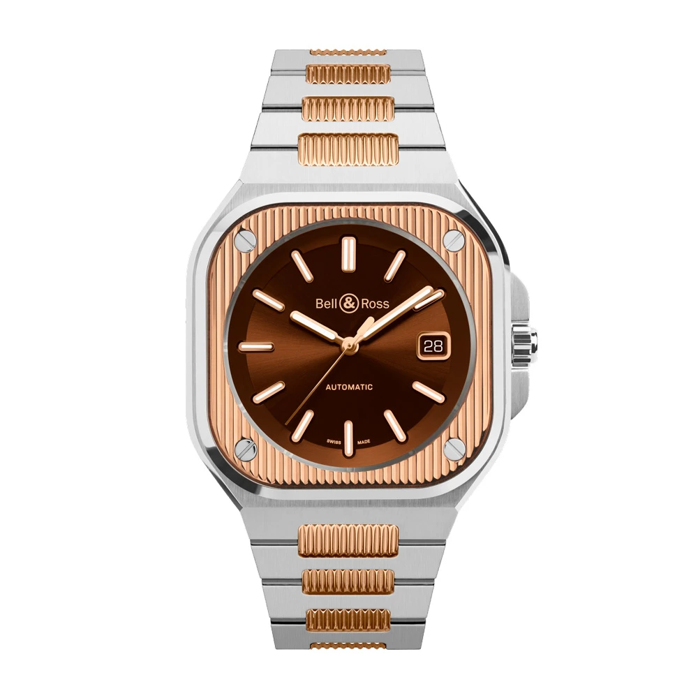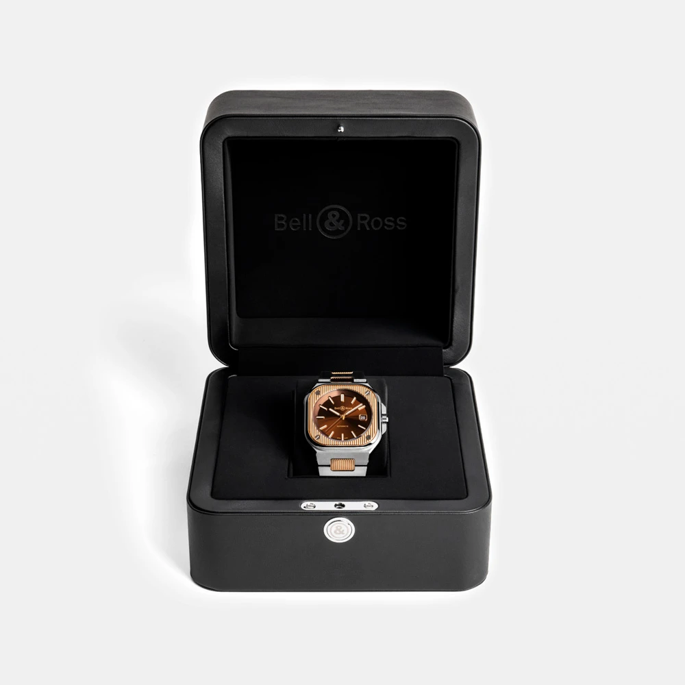 Bell & Ross BR05A-EL-GLST/SSG – Artline Steel & Gold přináší precizní rovnováhu mezi luxusním dvoubarevným designem a městskou elegancí. Jeho 40 × 40 mm pouzdro kombinuje nerezovou ocel a 18kt růžové zlato, doplněné o sofistikovaný hnědý sunray ciferník s aplikovanými indexy a skeletonizovanými ručičkami. Sklo je safírové s antireflexní úpravou a zadní strana nabízí průhled do mechanismu.