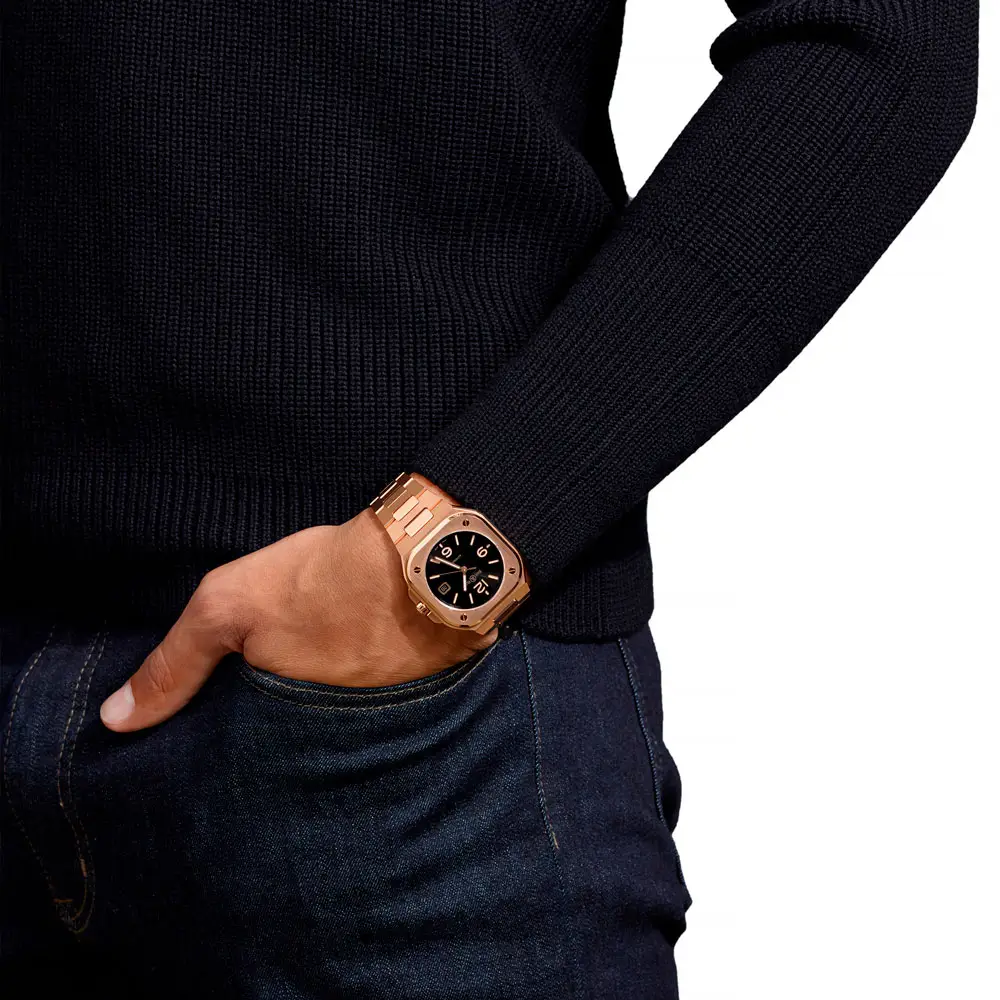 Model Bell & Ross BR 05 Gold je mimořádným ztělesněním luxusu a technické preciznosti. Jeho hranaté pouzdro zaujme nejen tvarem, ale především použitým materiálem – je celé vyrobeno z 18kt růžového zlata, což mu dodává výraznou eleganci a nadčasový vzhled. Velikost pouzdra činí 40 mm, takže hodinky působí kompaktně, ale zároveň výrazně. Čelní stranu kryje odolné safírové sklo, které chrání citlivý mechanismus i ciferník před poškrábáním.