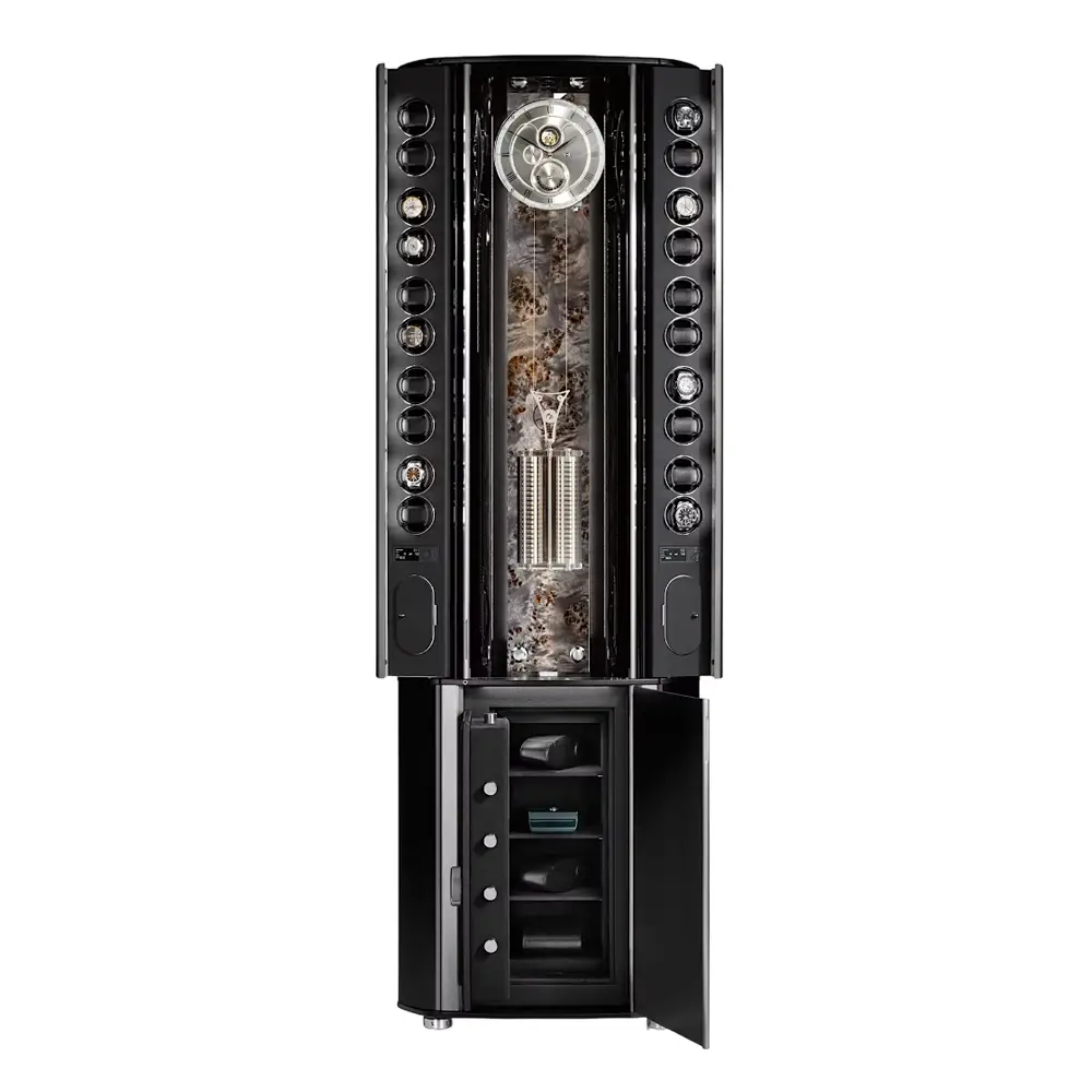 Trezor disponuje certifikací VdS/ECB•S, což zaručuje nejvyšší bezpečnostní standardy. Interiér je mistrovsky zpracován – jemné čalounění, prémiové dřevěné a kožené prvky, a především inteligentní LED osvětlení, které při otevření stylově nasvítí celý obsah. Součástí jsou i integrované natahovače hodinek (watch windery), díky nimž budou vaše luxusní hodinky vždy připravené k nošení.