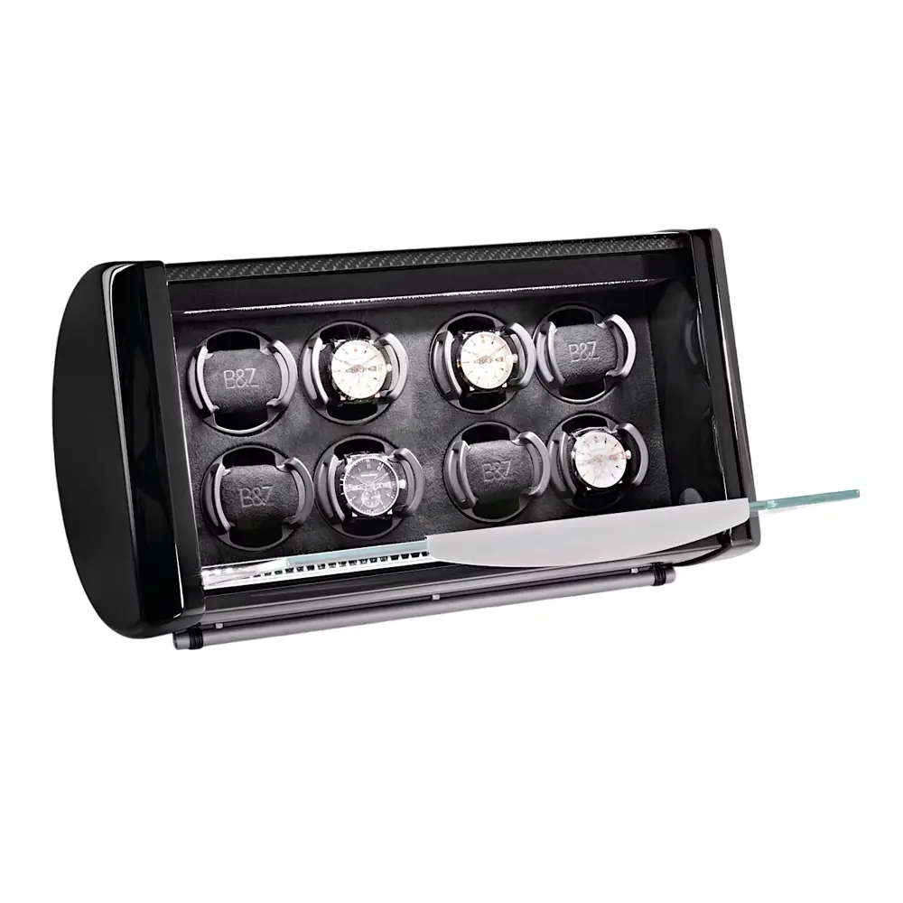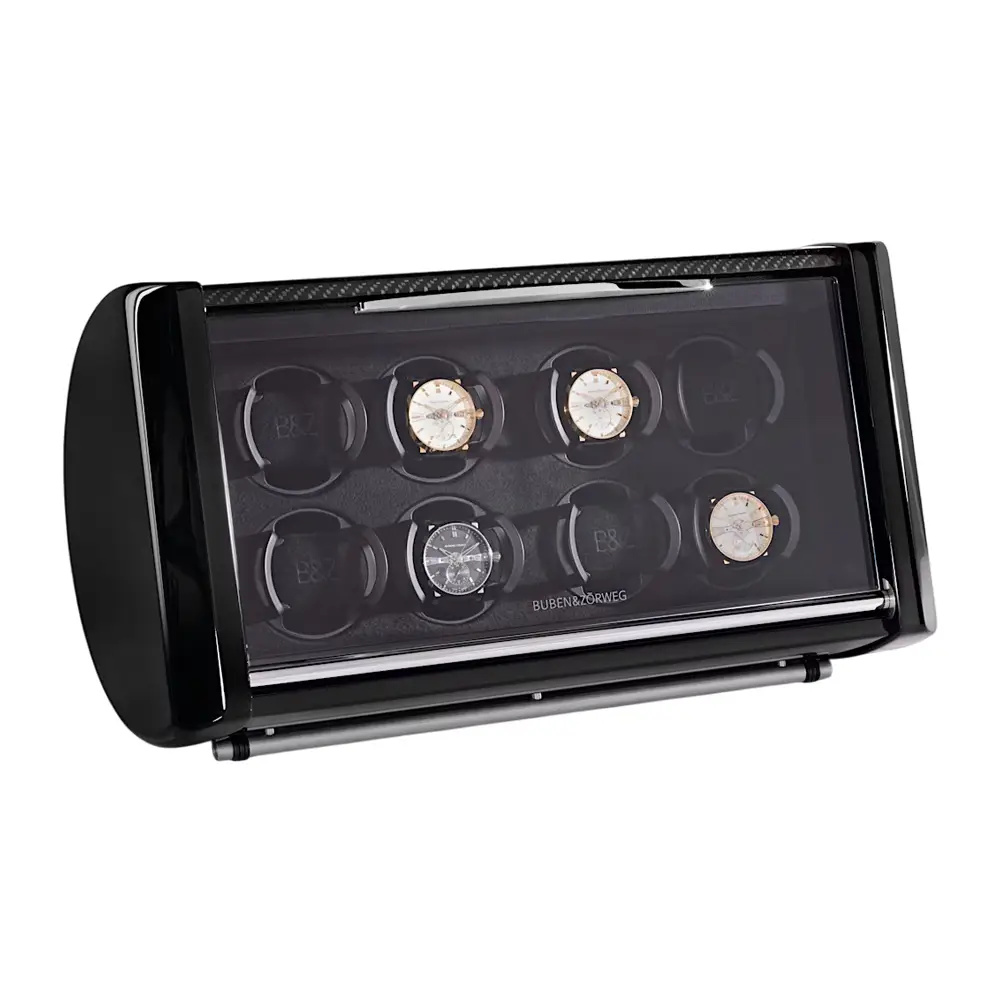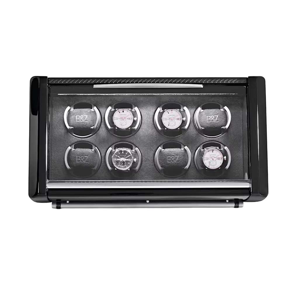 Natahovač hodinek Buben & Zorweg SPIRIT 8 představuje dokonalé spojení luxusního designu, precizní technologie a špičkového řemeslného zpracování. Tento model pojme až osm automatických hodinek a kombinuje elegantní tělo z kartáčovaného hliníku s detaily z ušlechtilých materiálů, jako je karbon, croco nebo dřevo macassar. Přední prosklená stěna z bezpečnostního skla umožňuje obdivovat vaši sbírku i během chodu zařízení, zatímco interiér v jemném veluru chrání hodinky před poškozením.
