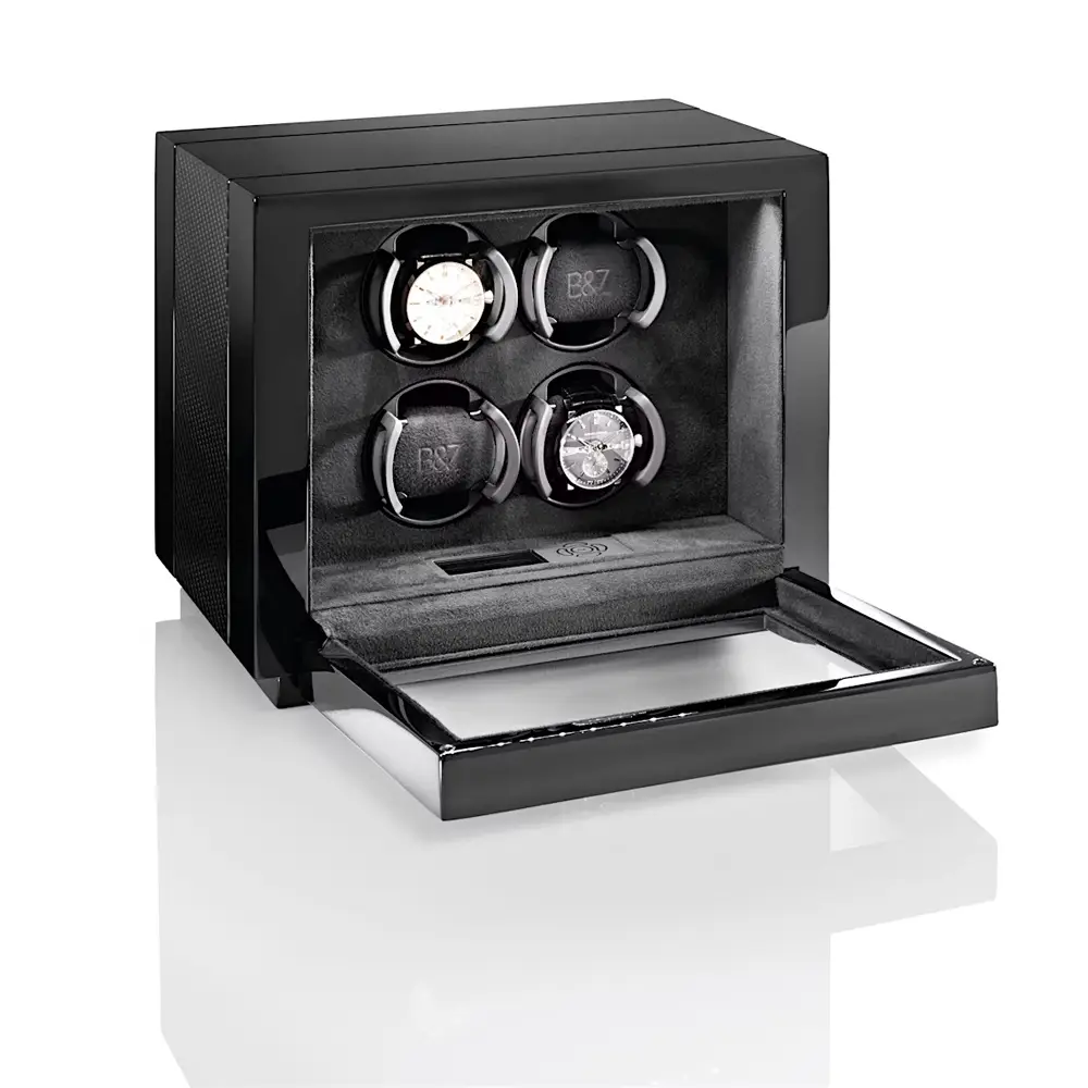 Natahovač hodinek Buben & Zorweg VANTAGE 4 Carbon představuje luxusní řešení pro bezpečné a elegantní uložení až čtyř automatických hodinek. Jeho moderní design kombinuje vysoce lesklý černý lak s karbonovými detaily, které dodávají přístroji sportovní, ale zároveň sofistikovaný vzhled. Přední prosklené víko umožňuje stylovou prezentaci hodinek, zatímco uzamykatelný mechanismus a precizní zpracování zaručují maximální ochranu vaší kolekce.