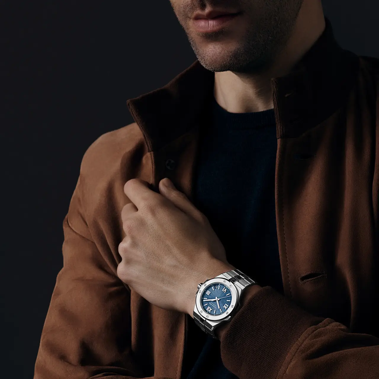 Výrazným prvkem je modrý analogový ciferník, jehož textura evokuje povrch horských jezer. Jemné ručky a indexy dokonale kontrastují s podkladem a vytvářejí přehledné a elegantní zobrazení času. Nechybí ani diskrétní datumovka, která zvyšuje praktičnost hodinek.