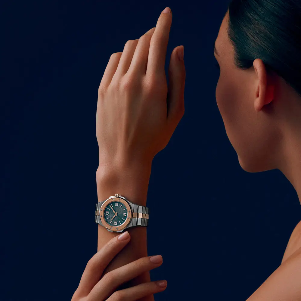 Pouzdro o průměru 36 mm je vyrobeno z nerezové oceli Lucent Steel™, jejíž lesk a odolnost symbolizují čistotu horského ledu. Luneta z 18kt růžového zlata dodává hodinkám teplý kontrast a podtrhuje jejich moderní bicolor charakter. Ciferník v odstínu orlího oka s jemnou texturou působí hluboce a elegantně, zatímco safírové sklo zajišťuje maximální ochranu. Díky vodotěsnosti 100 M (10 ATM) se model stává ideálním společníkem i pro aktivní životní styl.