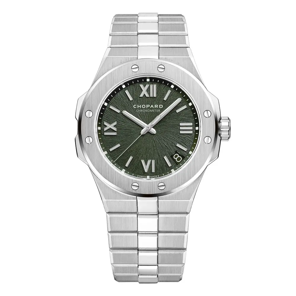 Chopard Alpine Eagle 298600-3014 představují moderní pojetí luxusních sportovně-elegantních hodinek inspirovaných silou a čistotou alpské přírody. Pouzdro a integrovaný náramek z exkluzivní slitiny Lucent Steel™ vynikají mimořádnou pevností, vysokým leskem a dlouhodobou odolností. Charakteristický číselník v borově zeleném odstínu s jemnou strukturou připomínající orlí duhovku doplňují výrazné římské číslice a precizně zpracované indexy, které podtrhují osobitý a sebevědomý vzhled modelu.