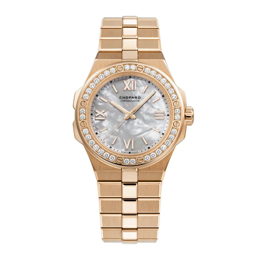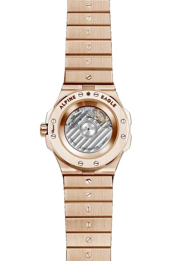 Model Chopard Alpine Eagle Small 295370-5002 přináší jedinečnou kombinaci síly a jemnosti v designu, který vzdává hold alpské přírodě. Pouzdro o průměru 36 mm z 18kt růžového zlata je bohatě zdobené diamantovou lunetou, která dodává hodinkám třpytivou noblesu bez ztráty elegance.