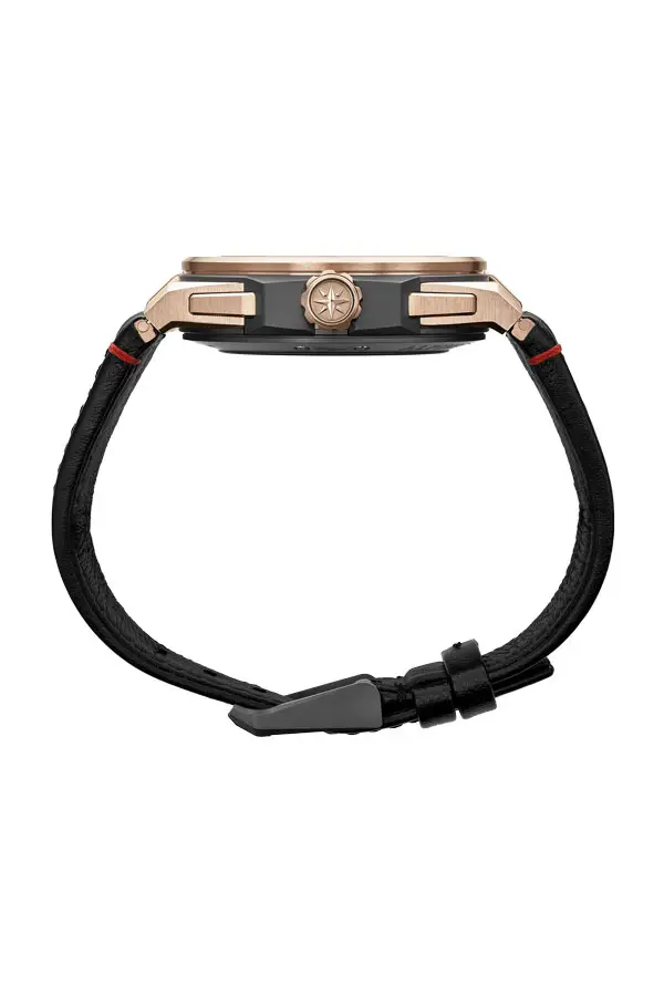 Masivní kulaté pouzdro o průměru 44 mm je osazeno výraznou lunetou z růžového zlata, která elegantně rámuje černý analogový ciferník s jemnou strukturou a kontrastními subciferníky chronografu. Funkčnost doplňuje datumovka, která je diskrétně integrována do designu.