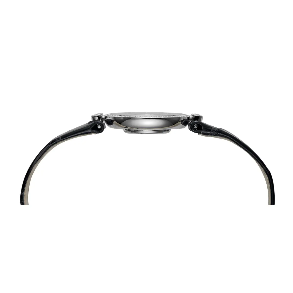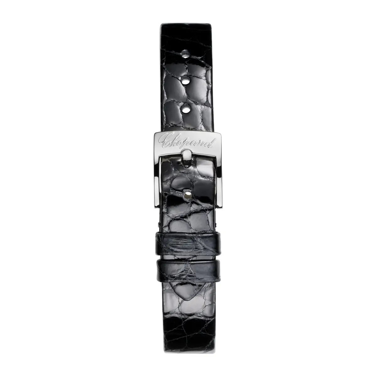 Černý řemínek z aligátoří kůže poskytuje dokonalý kontrast k lesku bílého zlata a zajišťuje pohodlné a elegantní nošení. Trnová spona je klasickou, ale stále osvědčenou volbou pro bezpečné zapnutí.