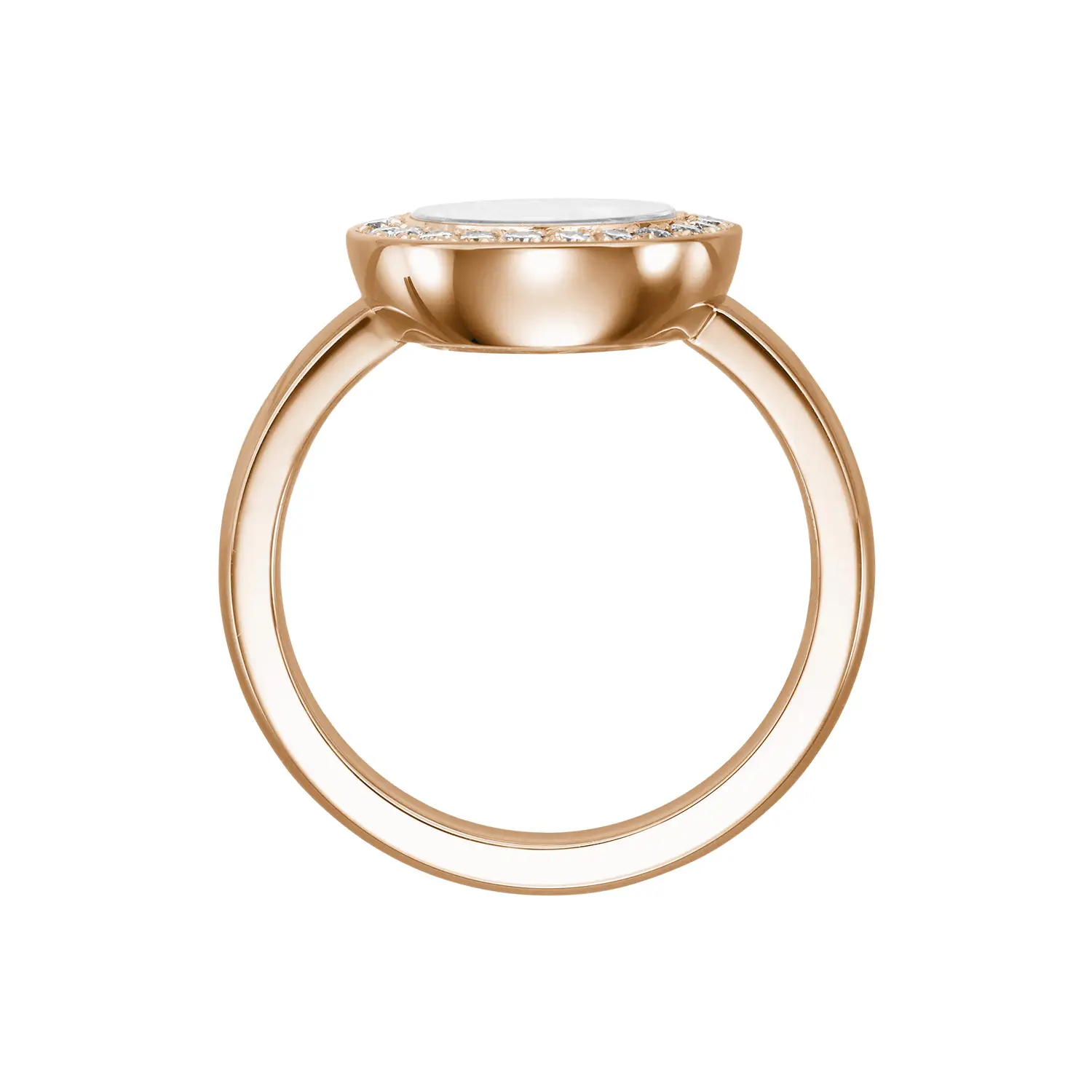 Chopard Happy Diamonds 82A018‑5212 je jemný dámský prsten z ikonické kolekce Happy Diamonds Icons, která propojuje nadčasovou eleganci, hravost a precizní šperkařské umění. Vyroben je z 18kt růžového zlata a zdobí jej 25 volně se pohybujících diamantů, uzavřených mezi dvěma safírovými krystaly. Tento jedinečný prvek vytváří fascinující efekt „tancujících diamantů“, které se třpytí při každém pohybu.