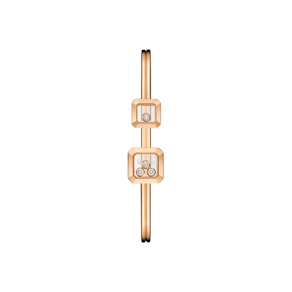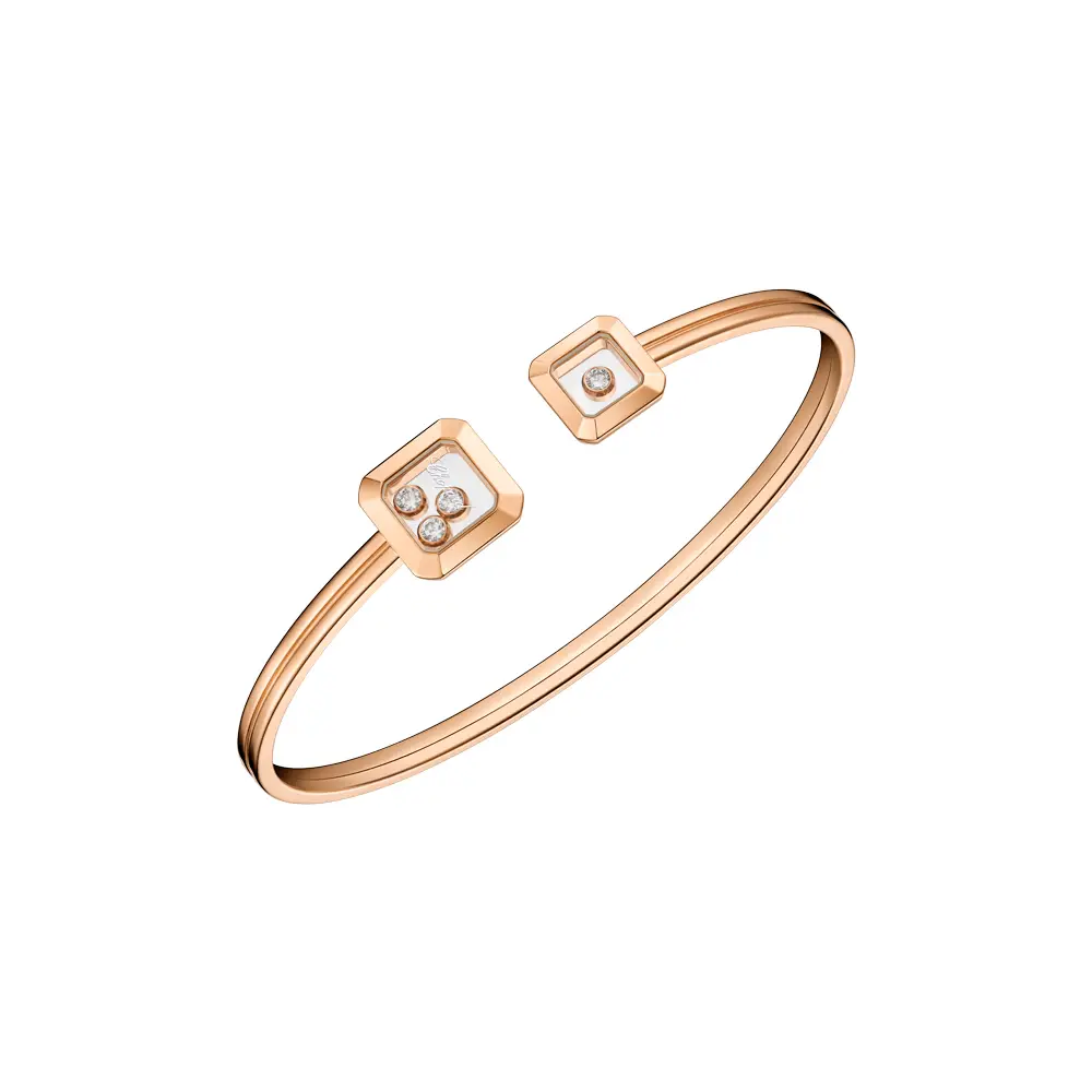 V srdci náramku se třpytí čtyři diamanty o celkové hmotnosti 0,20 ct, precizně zasazené tak, aby se mohly volně pohybovat. Tento jedinečný design nejen podtrhuje výjimečné řemeslné zpracování značky Chopard, ale zároveň odráží její filozofii „joie de vivre“ – radost z každého okamžiku.