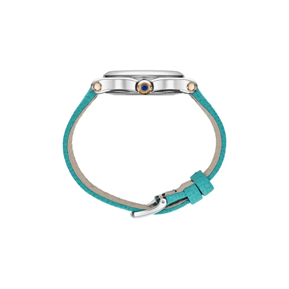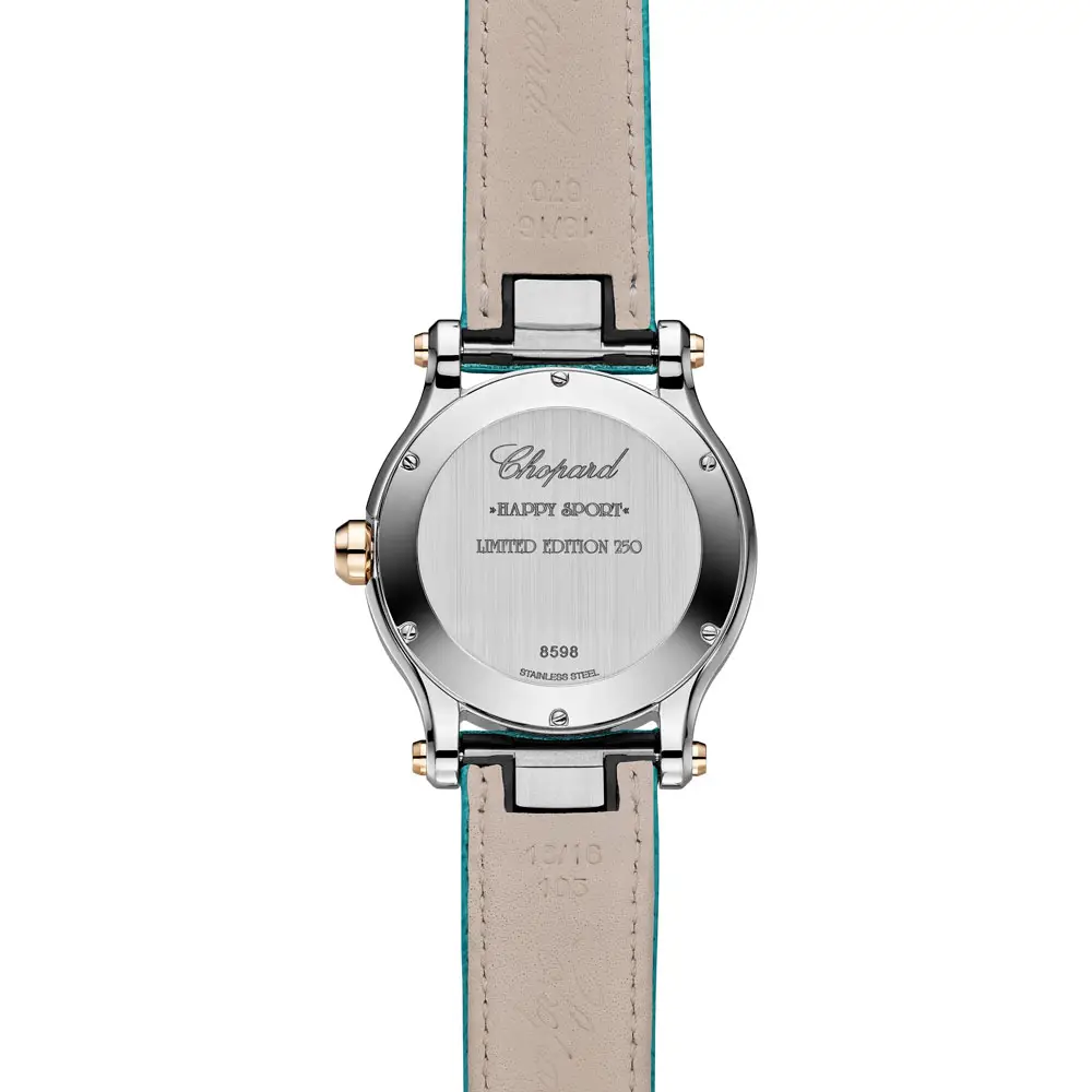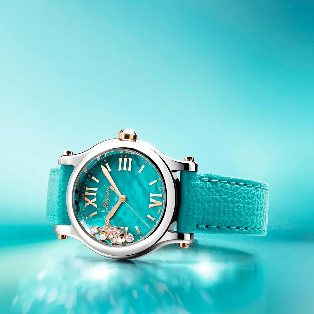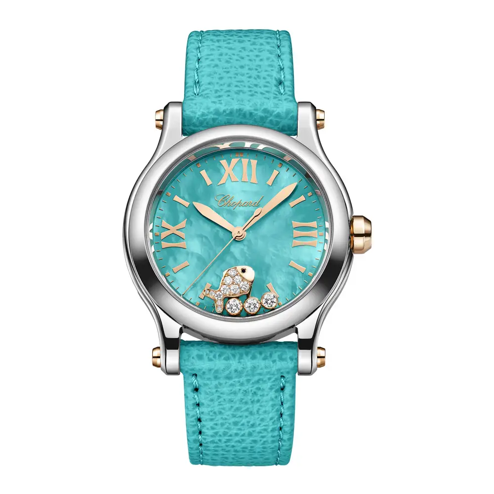 Hlavním poutačem je modro-tyrkysový perleťový číselník, na kterém pluje stylizovaná zlatá rybka – motiv „Happy Fish“ – doprovázená třemi volně pohyblivými diamanty a dvěma safírovými prvky. Tento snový design zachycuje iluzi pohybu a radosti, typickou pro kolekci Happy Diamonds. Ručičky a detaily v odstínu růžového zlata dotvářejí harmonii celku.
