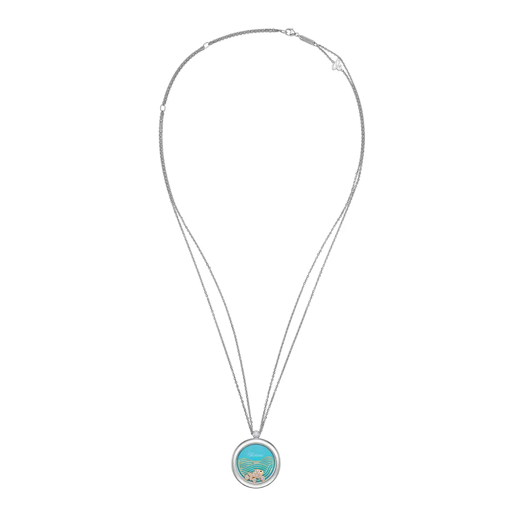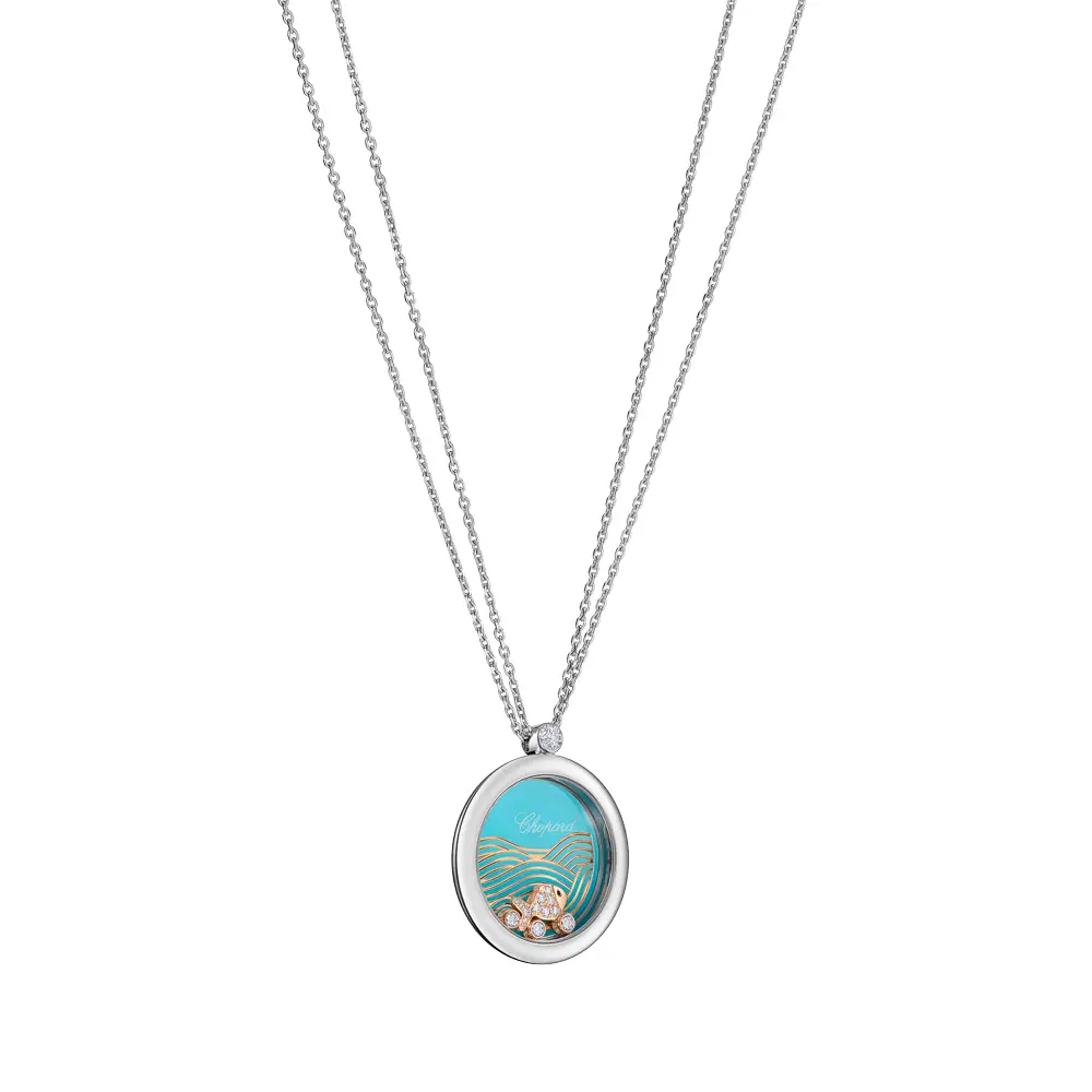 Vyroben z 18kt bílého a růžového zlata, přívěsek zdobí volně se pohybující diamanty o celkové hmotnosti 0,36 ct, které se vznášejí mezi dvěma safírovými sklíčky. Každý pohyb přináší nový záblesk světla, připomínající odraz slunce na mořské hladině. Jemné zpracování a kontrast zlatých tónů vytvářejí harmonický a současně nadčasový dojem.