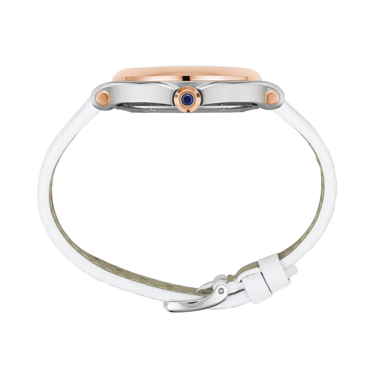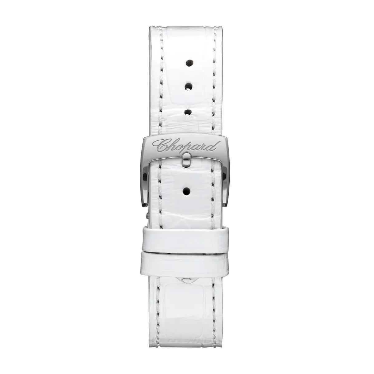 Bílý řemínek z aligátoří kůže doplňuje celkovou čistotu designu a kontrastuje s teplým tónem zlata. Trnová spona zajišťuje klasické a bezpečné upevnění.