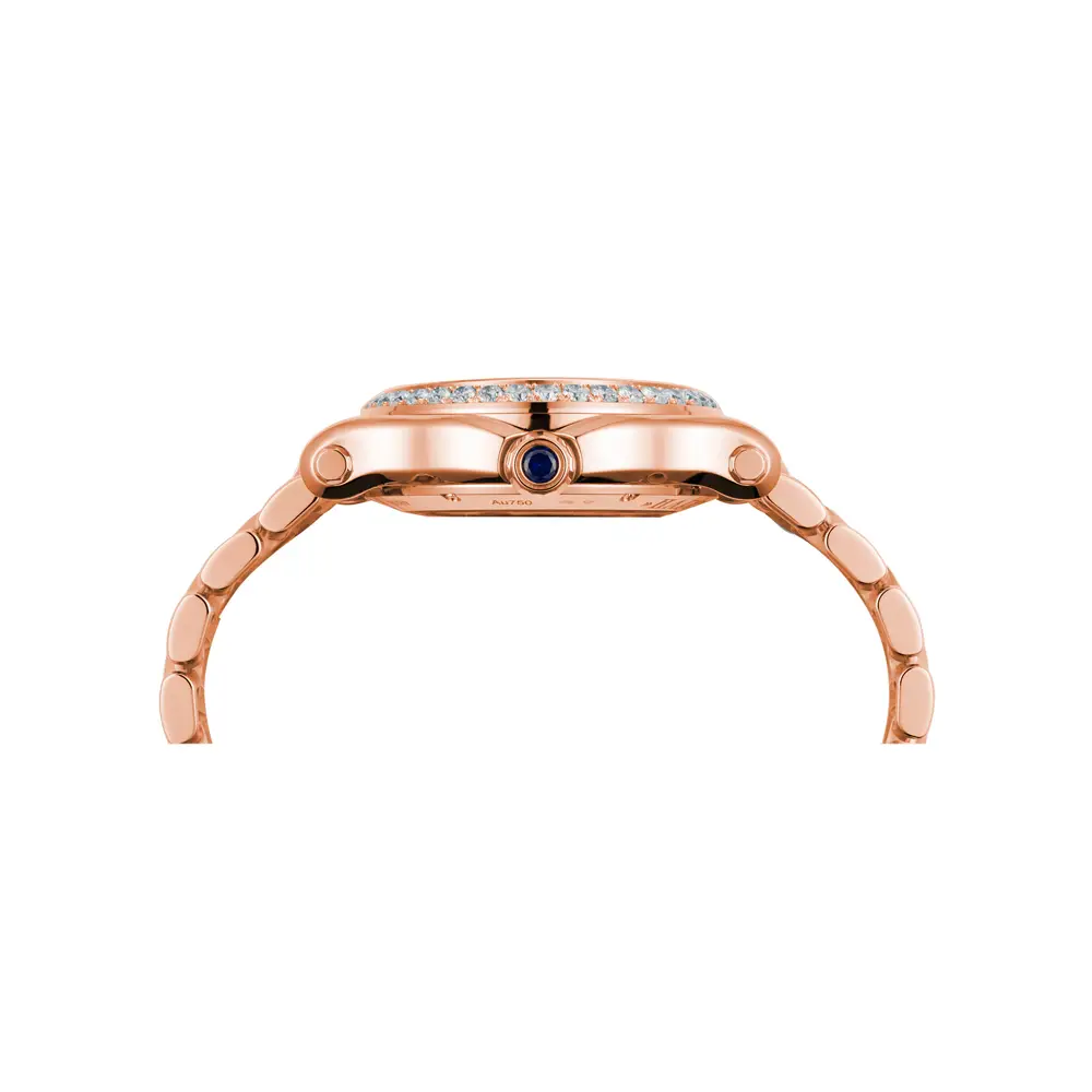Kulaté pouzdro o průměru 36 mm, luneta osázená diamanty, integrovaný náramek z růžového zlata – každý detail odráží ušlechtilost a harmonii. Pod safírovým sklíčkem se nachází stříbrný ciferník s pohyblivými diamanty, které tančí při každém pohybu a rozzáří váš den.