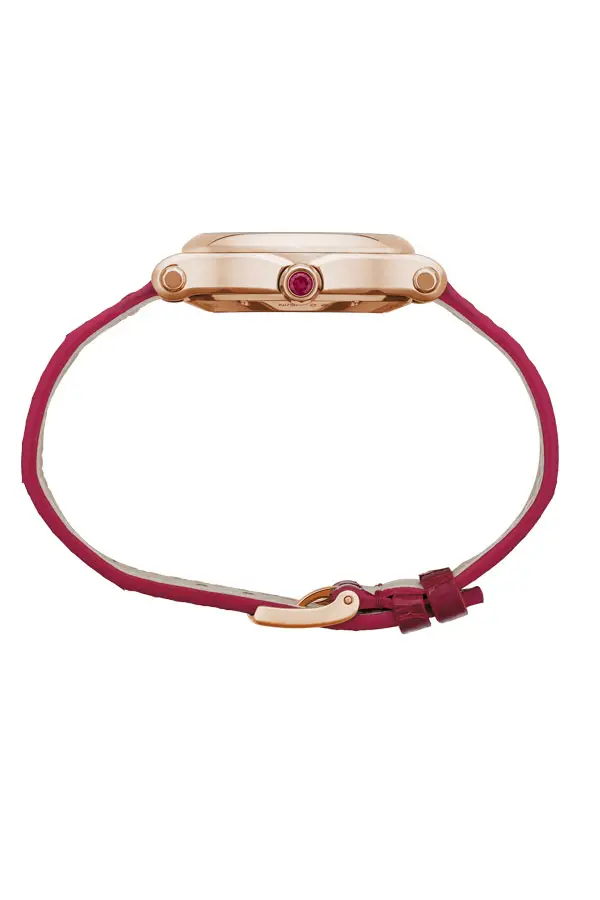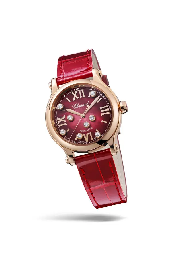 Pouzdro o průměru 33 mm z 18kt růžového zlata chrání červený ciferník se římskými číslicemi a osmi volně se pohybujícími diamanty, které se elegantně vznášejí mezi dvěma safírovými sklíčky a zachycují světlo při každém pohybu zápěstí. Safírové sklo s antireflexní úpravou zaručuje maximální čitelnost a odolnost. Červený řemínek z aligátoří kůže s trnovou sponou doplňuje luxusní charakter modelu.