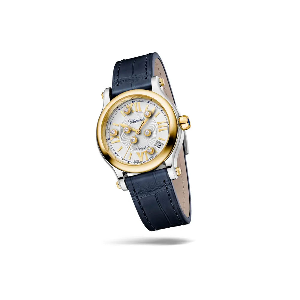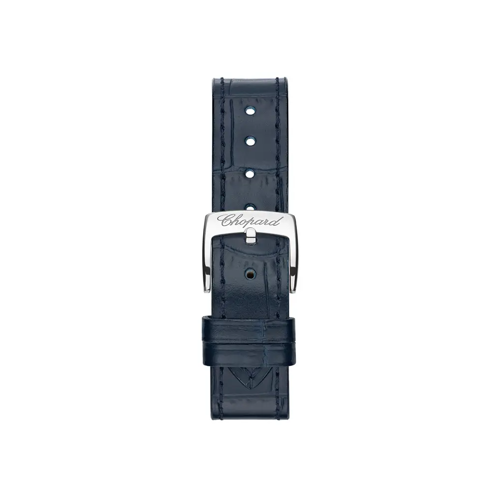 Uvnitř hodinek pracuje automatický strojek s rezervou chodu až 62 hodin, který je známý svou spolehlivostí a precizností. Model je osazen modrým řemínkem z aligátoří kůže s klasickou sponou a disponuje vodotěsností do 30 metrů. Chopard Happy Sport v tomto provedení je vyjádřením svobody, hravosti a výjimečného stylu – ideální volba pro ženy s citem pro krásu i technickou dokonalost.