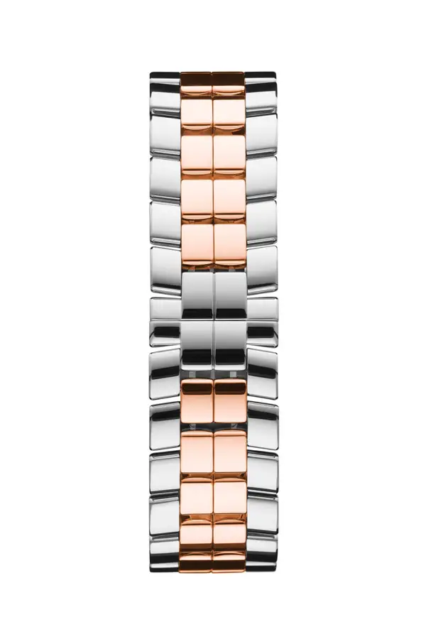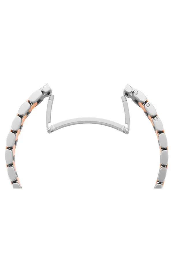 Velkolepý dojem dotváří dvoubarevný náramek z oceli a 18kt růžového zlata s elegantní překlápěcí sponou, který pevně a pohodlně obepne vaše zápěstí.
