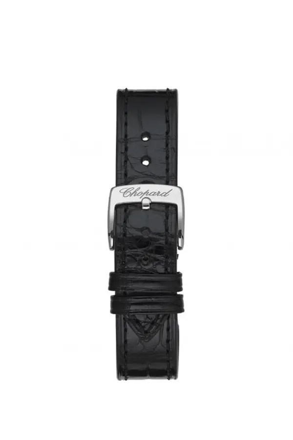 Jejich kulaté ocelové pouzdro o průměru 30 mm zaujme čistými liniemi a safírovým sklem, pod kterým se třpytí stříbrný ciferník s pohyblivými diamanty. Elegantní černý řemínek z aligátoří kůže se stylovou trnovou sponou podtrhuje decentní luxus celku.
