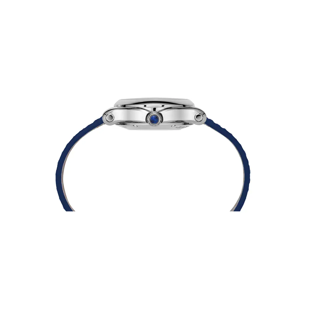 Kulaté ocelové pouzdro o průměru 36 mm je elegantně doplněno modrým ciferníkem, který dokonale ladí s koženým řemínkem v identickém odstínu. Jemně zasazená datumovka zajišťuje praktické využití bez narušení čistého designu. Nad tím vším se klenutí safírové sklíčko, které chrání ciferník před poškrábáním.