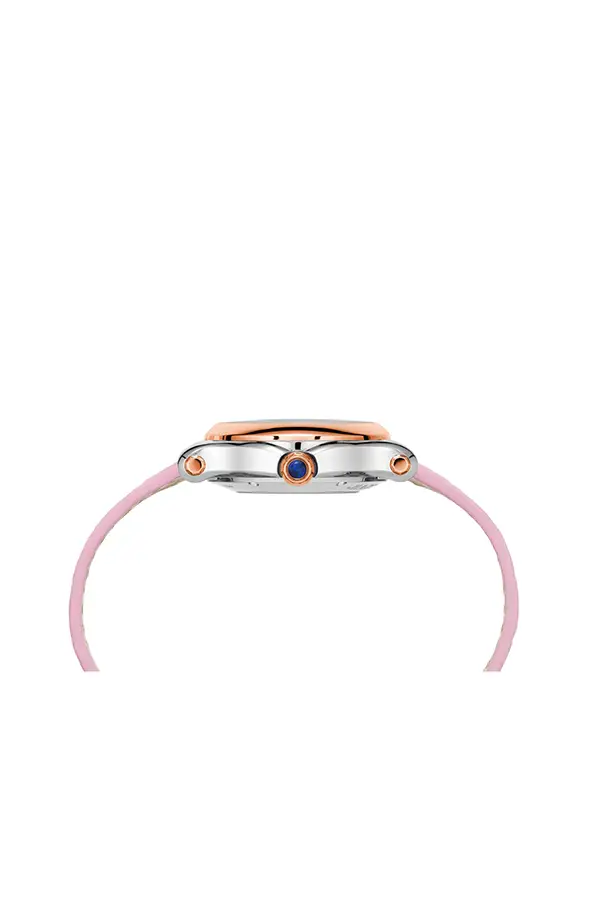 Kulaté ocelové pouzdro o průměru 30 mm je korunováno lunetou z 18kt růžového zlata, která ladně rámuje růžový ciferník s jemnými detaily. Růžový řemínek z aligátoří kůže tón v tónu dokonale doplňuje celkový vzhled a podtrhuje ženský půvab. Safírové sklíčko chrání ciferník před poškrábáním a dodává mu brilantní lesk.
