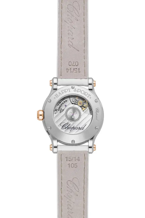Hodinky Chopard Happy Sport 278573-6020 ztělesňují dokonalou rovnováhu mezi švýcarskou hodinářskou precizností a noblesní ženskou estetikou. Jejich kulaté pouzdro o průměru 30 mm, vyrobené z kombinace ušlechtilé oceli a 18kt růžového zlata, přináší jemný kontrast chladné elegance a teplého šarmu.