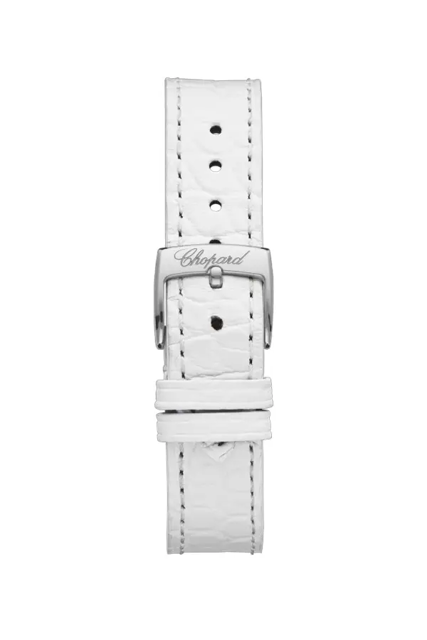 Pohodlné a stylové nošení zajišťuje bílý pásek z aligátoří kůže s tradiční trnovou sponou, který hodinkám dodává lehkost i romantický nádech. Uvnitř pracuje mechanický strojek s automatickým nátahem, zaručující spolehlivý a plynulý chod bez nutnosti ručního natahování.