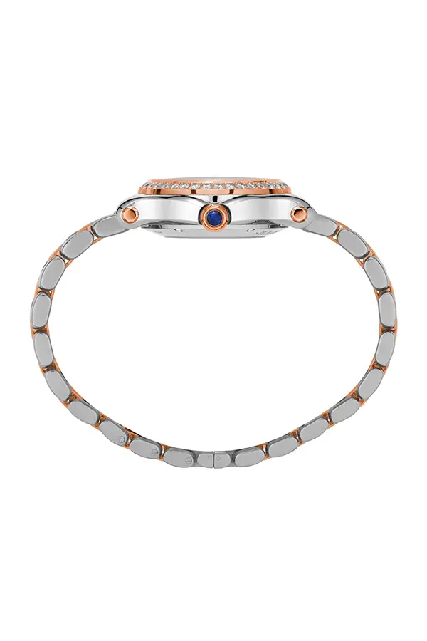 Kulaté pouzdro o průměru 30 mm skrývá pod safírovým sklíčkem třpytivý perleťový ciferník, který jemně odráží světlo při každém pohybu. Elegantní dvoubarevný náramek z oceli a růžového zlata s překlápěcí sponou zajišťuje pohodlné a bezpečné nošení, zatímco celý model působí jako šperk na zápěstí.
