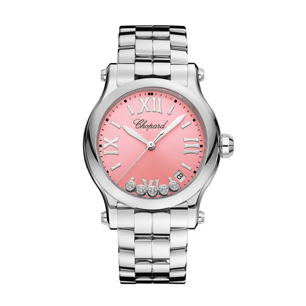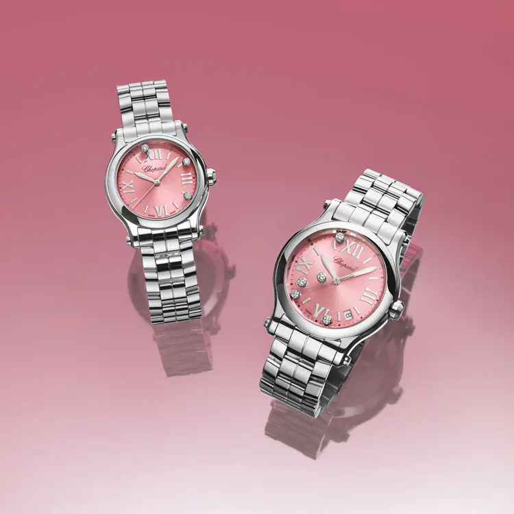Jemně růžový ciferník dodává hodinkám sofistikovaný nádech a vytváří dokonalé pozadí pro ikonické pohyblivé diamanty, které se volně vznášejí mezi dvěma safírovými sklíčky. Každý jejich pohyb rozzáří ciferník a přináší unikátní jiskru – symbol hravosti, svobody a ženské energie, která charakterizuje kolekci Happy Sport.