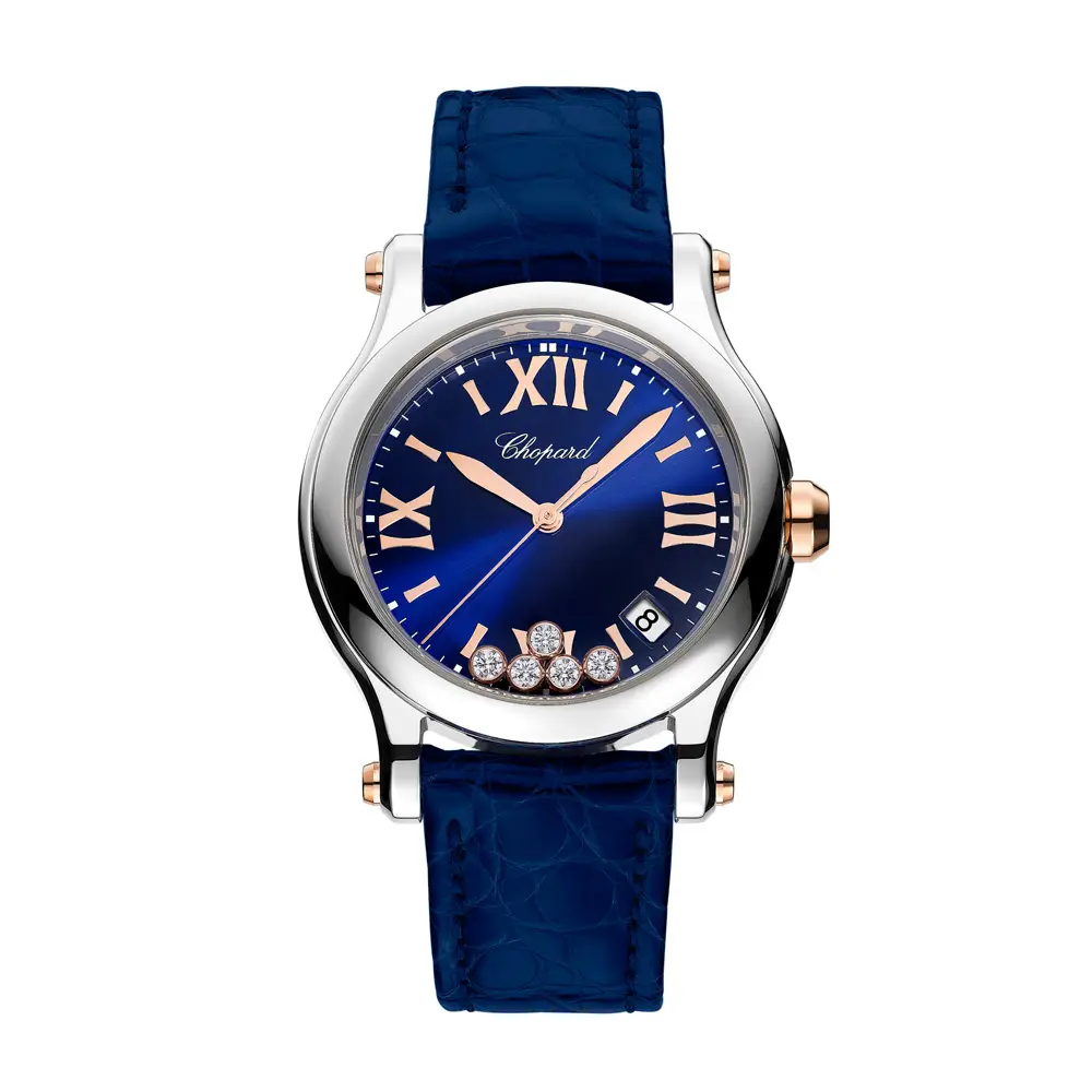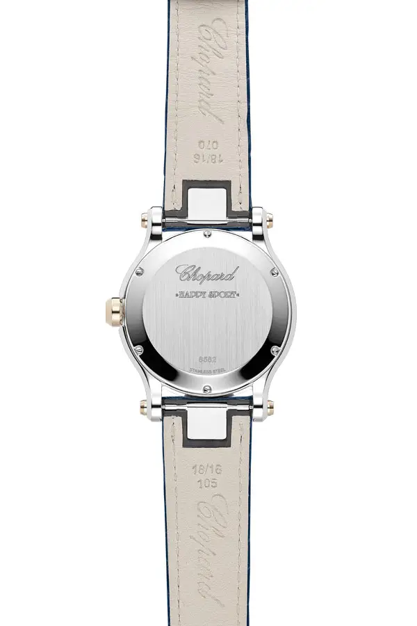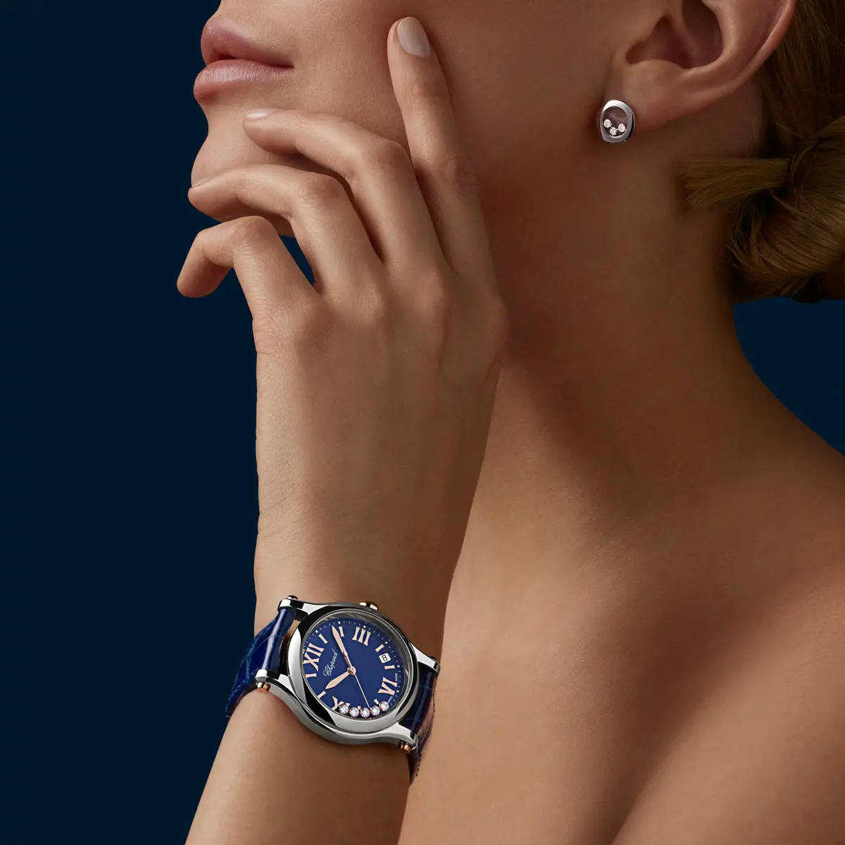Jeho 36mm pouzdro z nerezové oceli doplňuje jemně vroubkovaná ocelová luneta, chráněná safírovým sklem s antireflexní úpravou. Modrý analogový ciferník s decentní datumovkou na pozici 4. hodiny působí čistě a vyváženě, zatímco pět volně se pohybujících diamantů přináší ikonický prvek kolekce Happy Sport – radost a pohyb. Vodotěsnost do 30 metrů zajišťuje bezstarostné každodenní nošení.