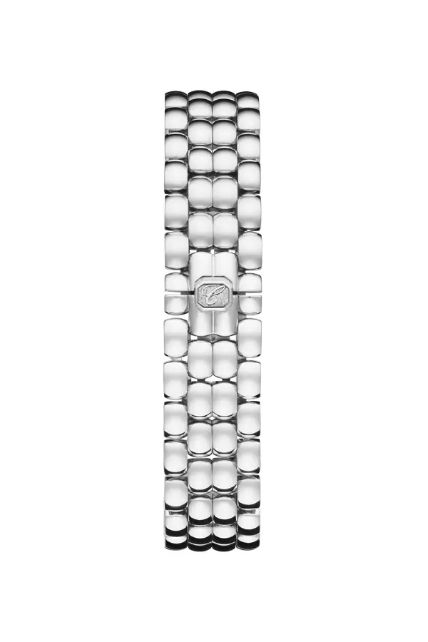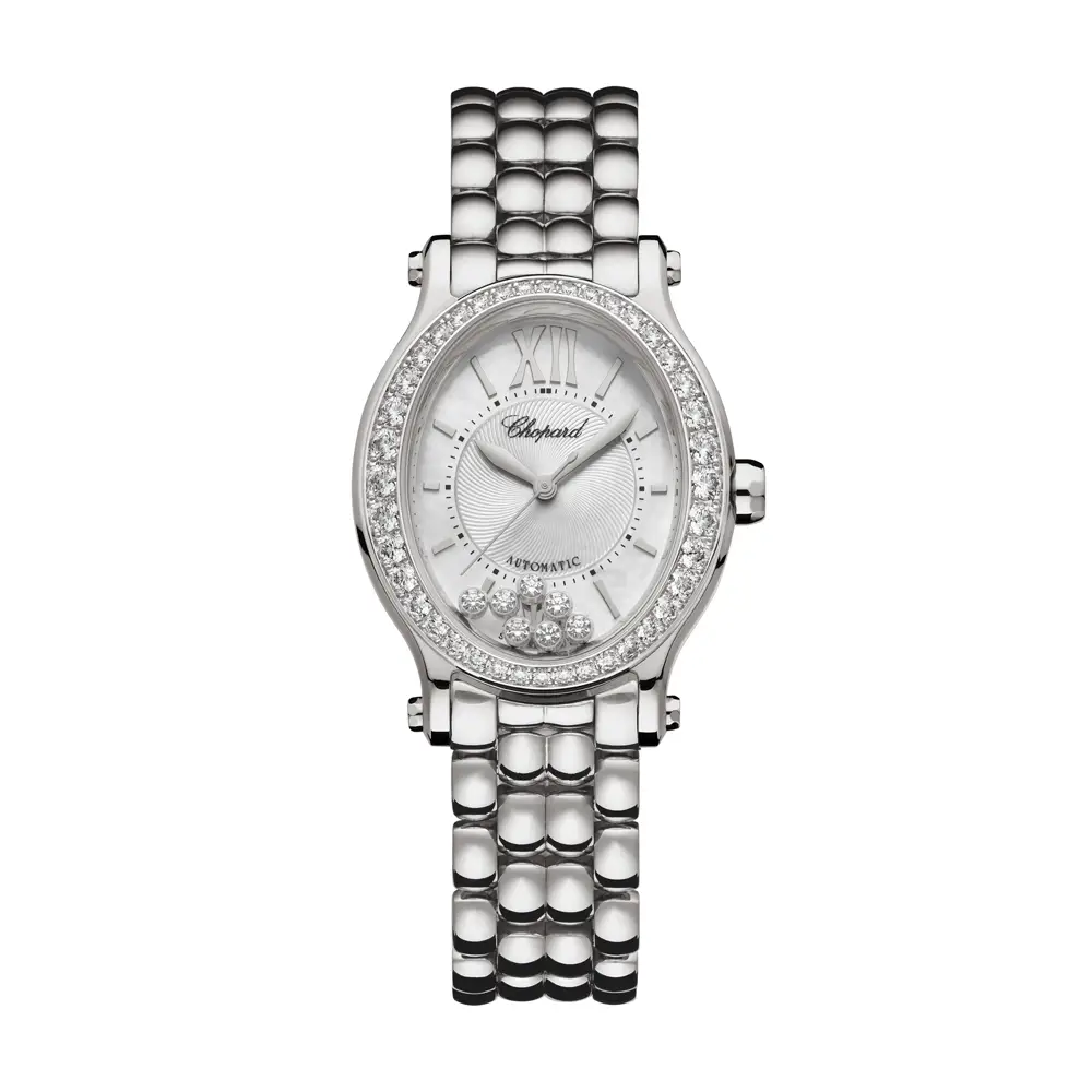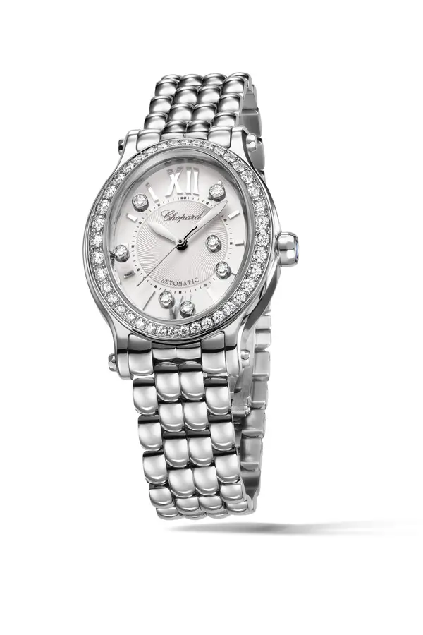 Tělo hodinek je vyrobeno z ušlechtilé oceli, kterou doplňuje luneta osazená diamanty, jež vytváří zářivý kontrast a podtrhují luxusní charakter modelu. Pod odolným safírovým sklíčkem se nachází stříbrný ciferník, na kterém se volně pohybují diamanty – ikonický prvek Chopard, který přináší hru světel a pohybu do každé vteřiny.