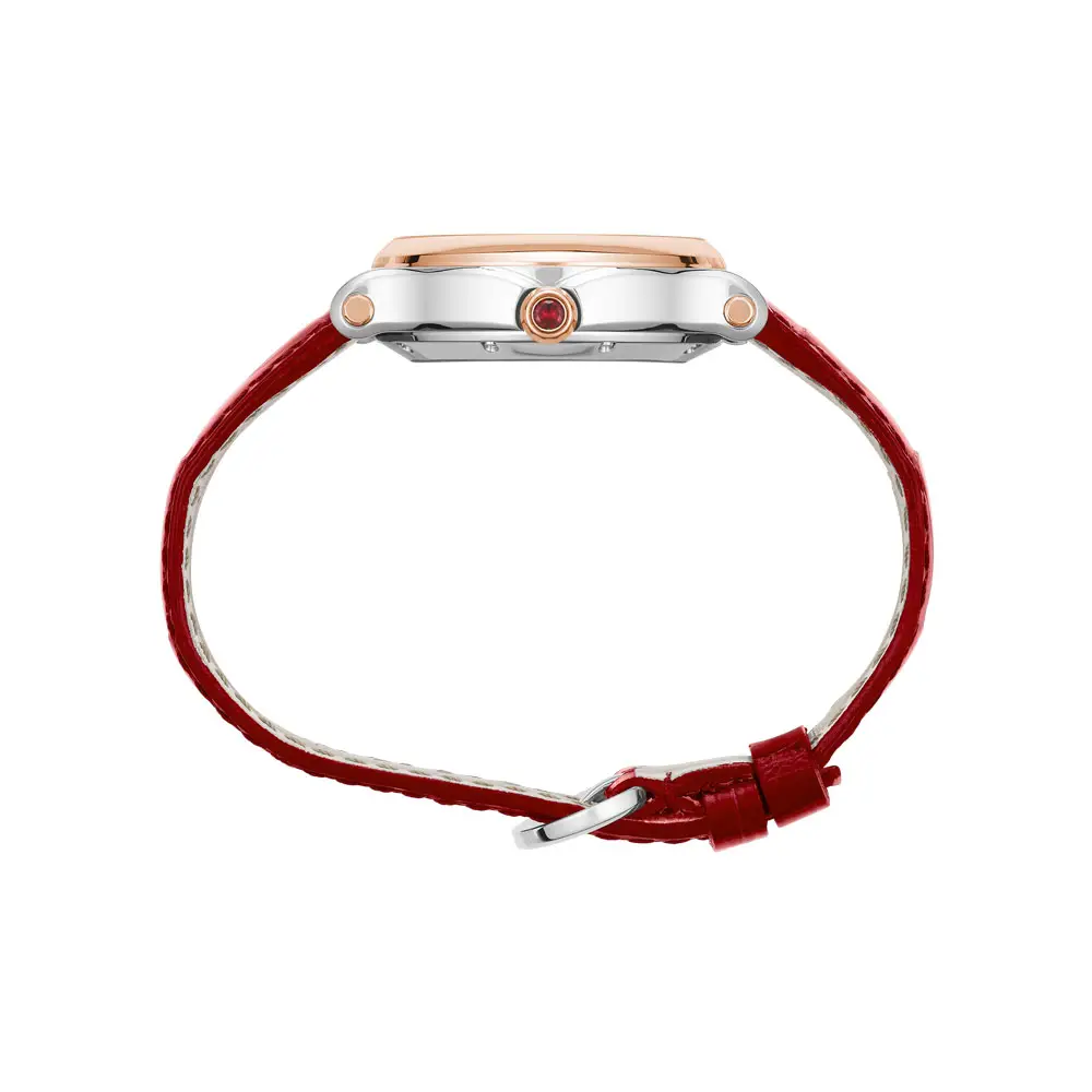 Model Chopard Happy Sport 278602-6006 ztělesňuje ženský půvab v elegantním barevném tónu burgundy. Jeho zaoblené oválné pouzdro o rozměrech 29 x 31 mm, vyrobené z nerezové oceli a 18kt růžového zlata, působí jemně a přitom luxusně. Výrazným prvkem je sytě vínový číselník, kterým volně tančí sedm diamantů – hravý detail, jenž je ikonickou součástí celé kolekce Happy Sport.
