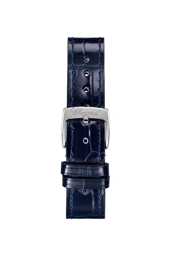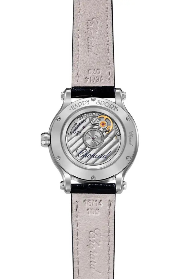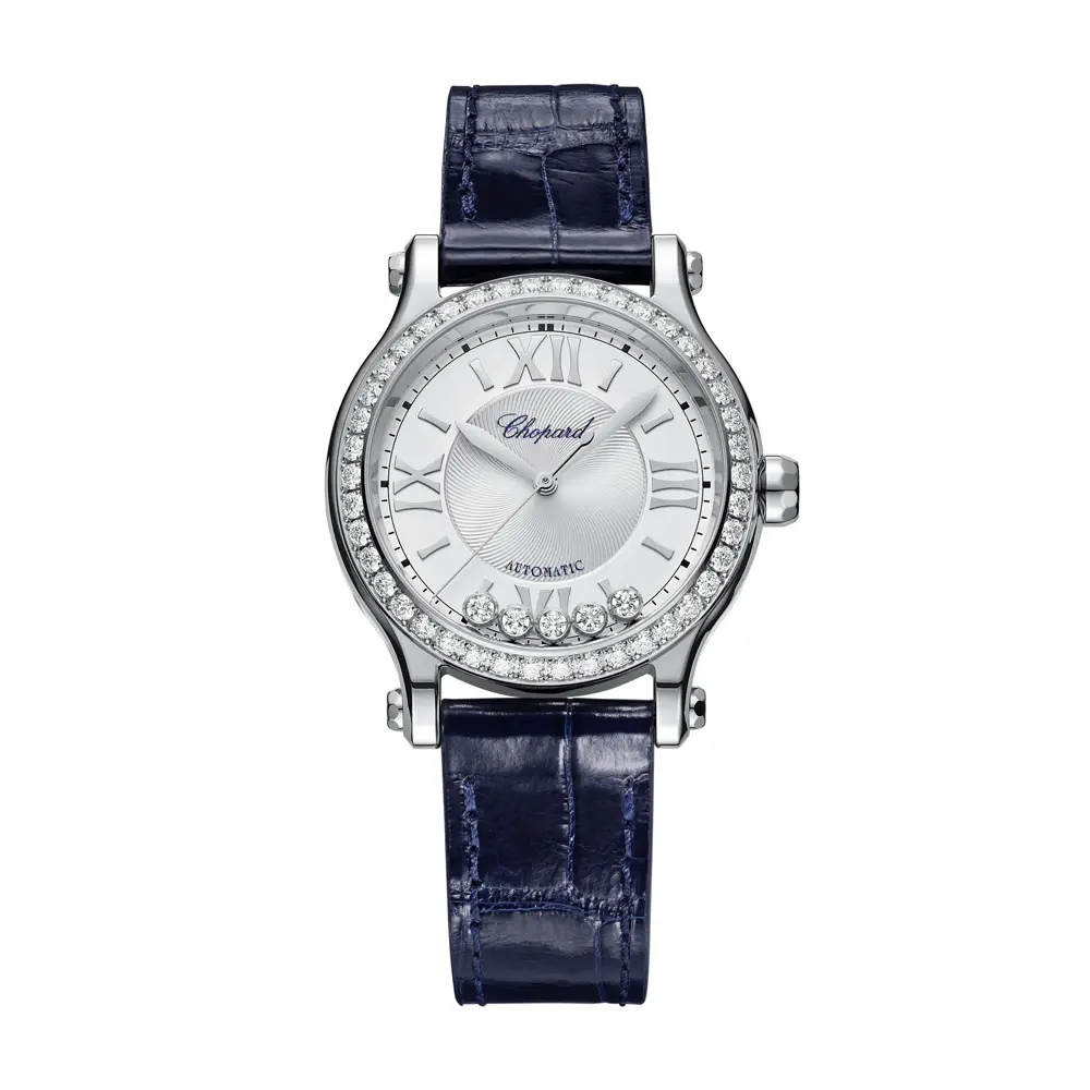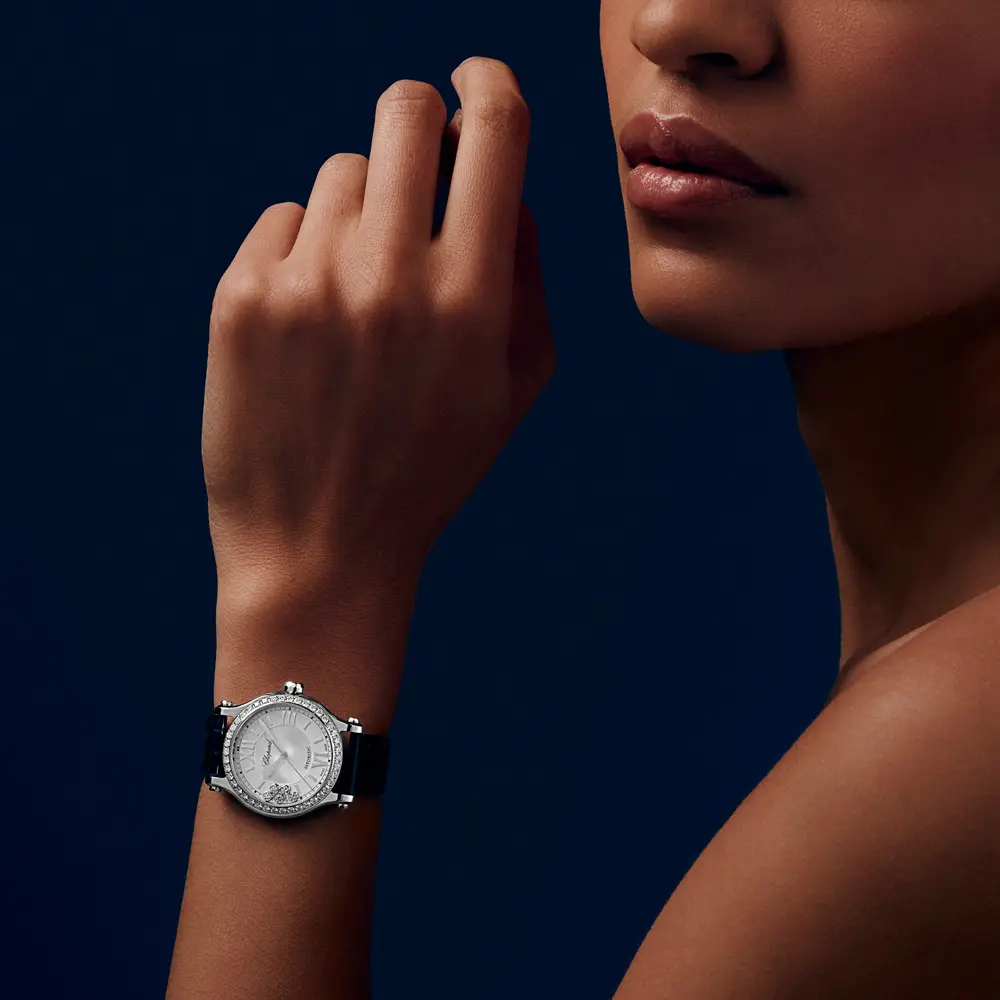 Pod safírovým sklíčkem odolným proti poškrábání se skrývá bílý ciferník se stříbrnými ručkami a římskými číslicemi, který zaručuje vynikající čitelnost. Největší pozornost však poutají pohyblivé diamanty, volně se vznášející mezi dvěma safírovými sklíčky – ikonický prvek kolekce Happy Sport, jenž vnáší do každého pohybu zápěstí hravý třpyt a světelnou eleganci.