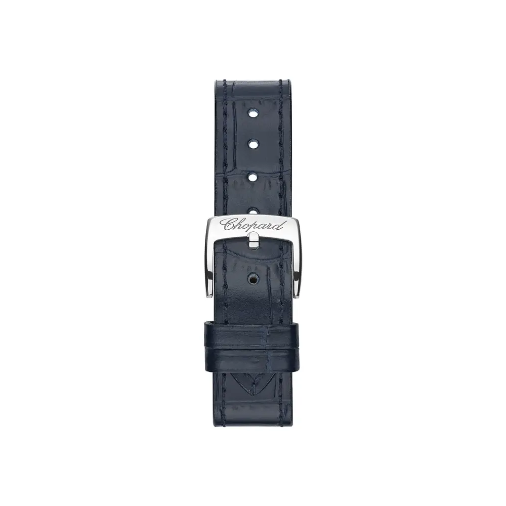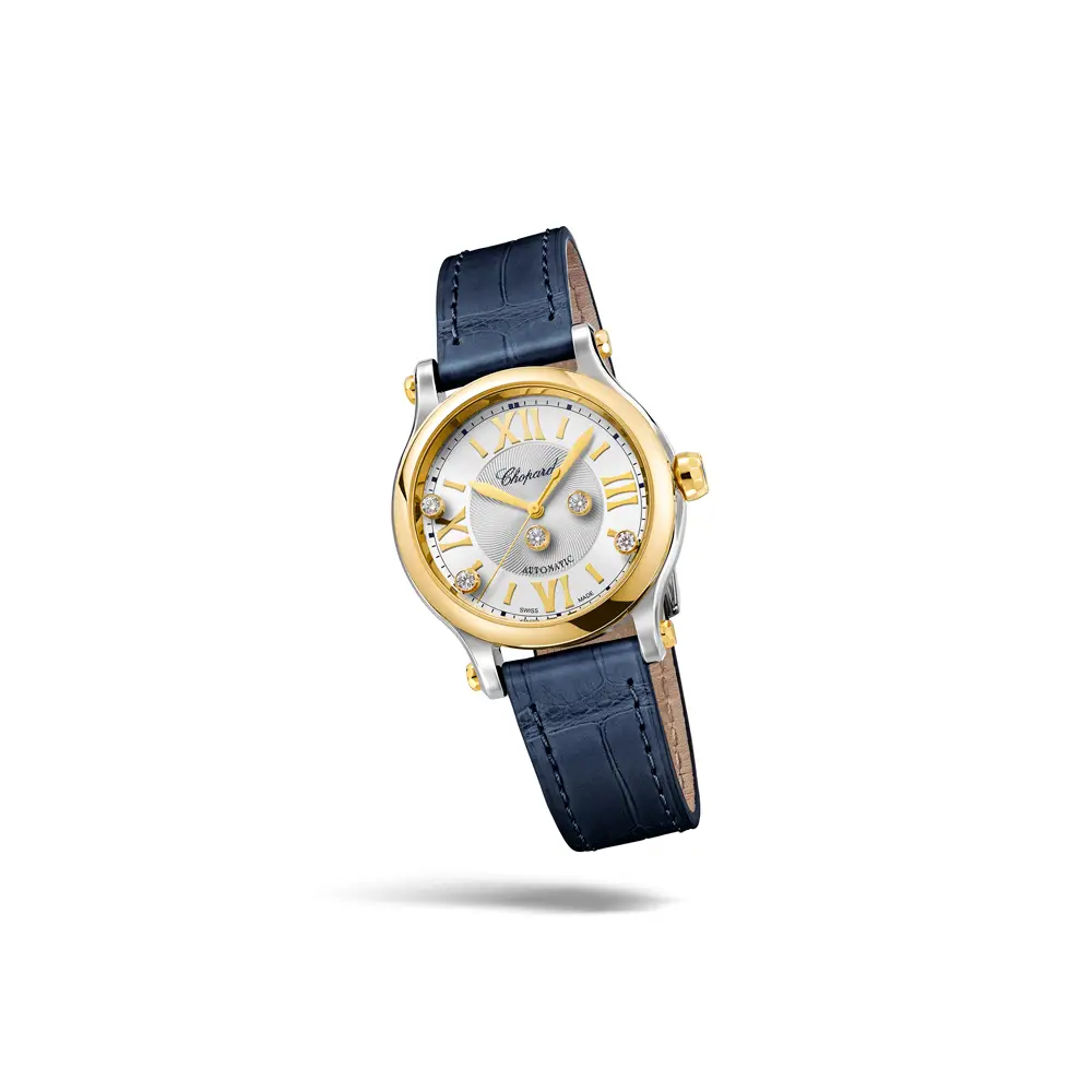 Uvnitř hodinek pracuje automatický strojek Chopard 09.01-C s rezervou chodu přibližně 42 hodin. Model je doplněn modrým řemínkem z aligátoří kůže a nabízí vodotěsnost do 30 metrů. Tato 33mm verze ikonické kolekce Happy Sport je ideální volbou pro ženy, které hledají kombinaci noblesy, preciznosti a jedinečného výrazu.