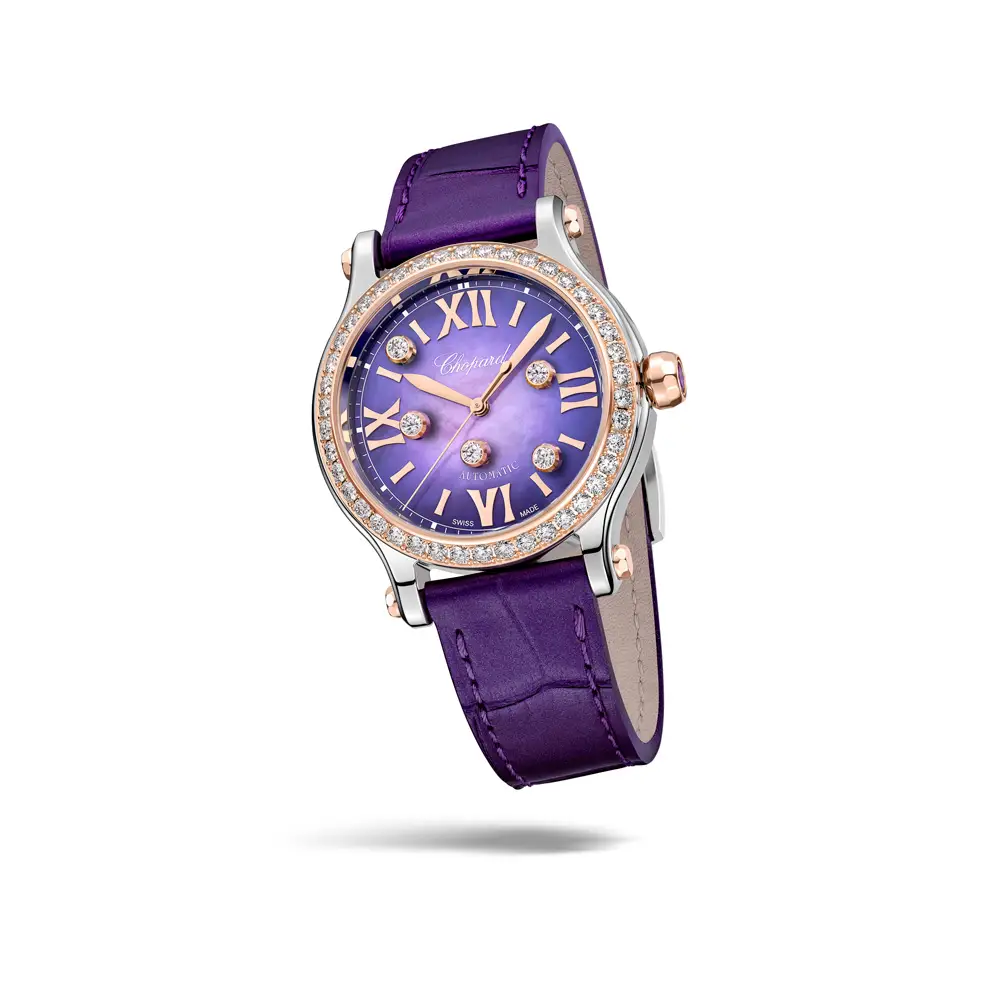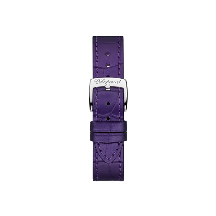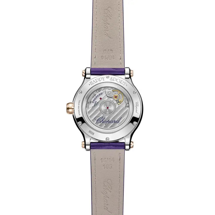 Uvnitř pracuje automatický strojek CHOPARD 09.01-C s rezervou chodu 42 hodin. Řemínek z fialové aligátoří kůže s trnovou sponou ladí s celkovým designem a zajišťuje pohodlí. Model je vodotěsný do 30 m a představuje dokonalou rovnováhu mezi luxusem, radostí a svobodným duchem kolekce Happy Sport.