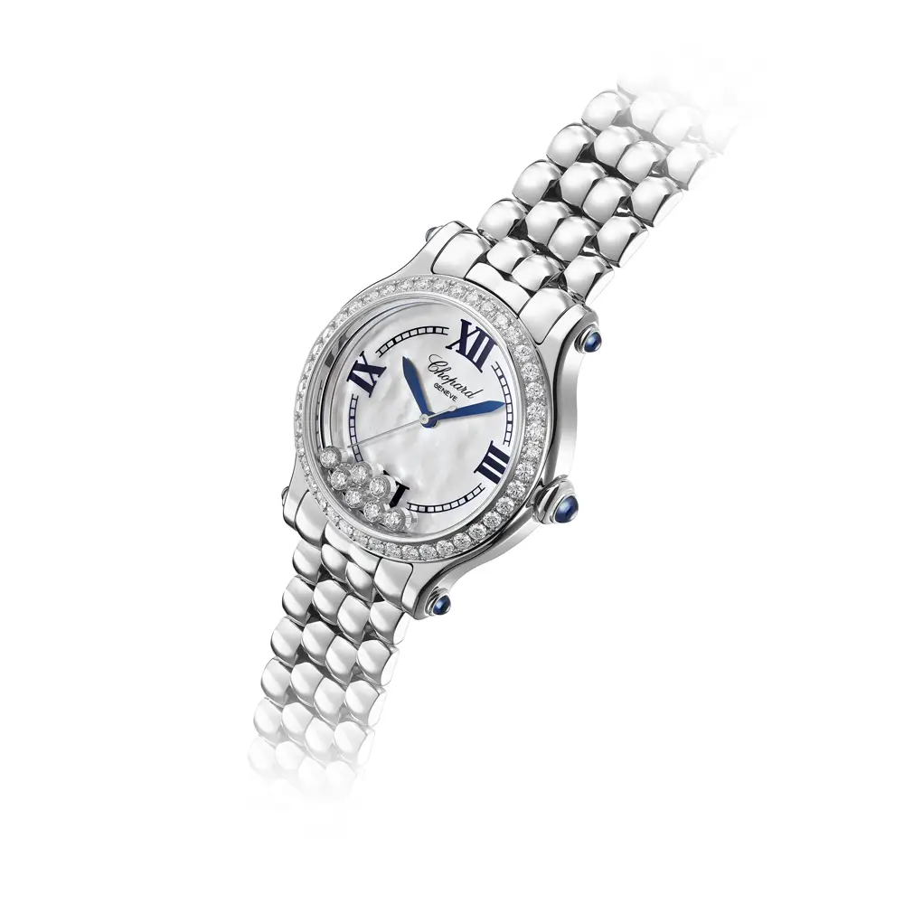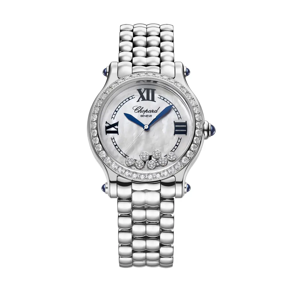 Pouzdro o průměru 33 mm z ušlechtilé oceli zdobí luneta osazená diamanty, která z každého pohledu činí slavnostní moment. Pod safírovým sklíčkem se rozprostírá perleťový ciferník s volně pohyblivými diamanty – ikonickým prvkem kolekce Happy Sport, který přináší do každého gesta radost a originalitu. Vodotěsnost 3 ATM (30 m) zaručuje spolehlivost při každodenním nošení.