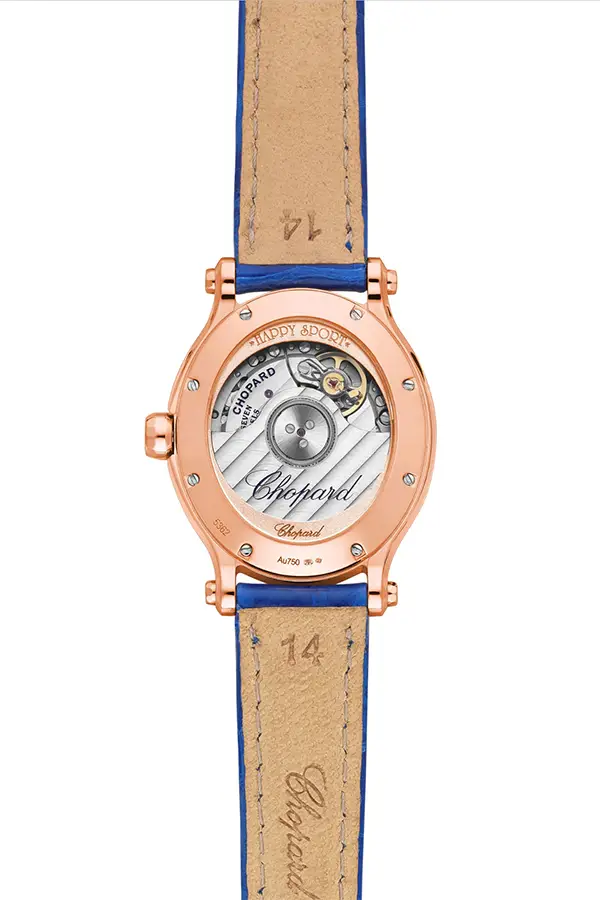 Pouzdro o rozměrech 31,31 × 29 mm z 18karátového růžového zlata doplňuje safírové sklo odolné proti poškrábání, chránící béžový ciferník s diamanty. Mezi dvěma sklíčky se volně pohybují tancující diamanty, které vytvářejí jiskřivou hru světla – ikonický prvek kolekce Happy Sport. Vodotěsnost do 30 metrů zajišťuje spolehlivost při běžném nošení.