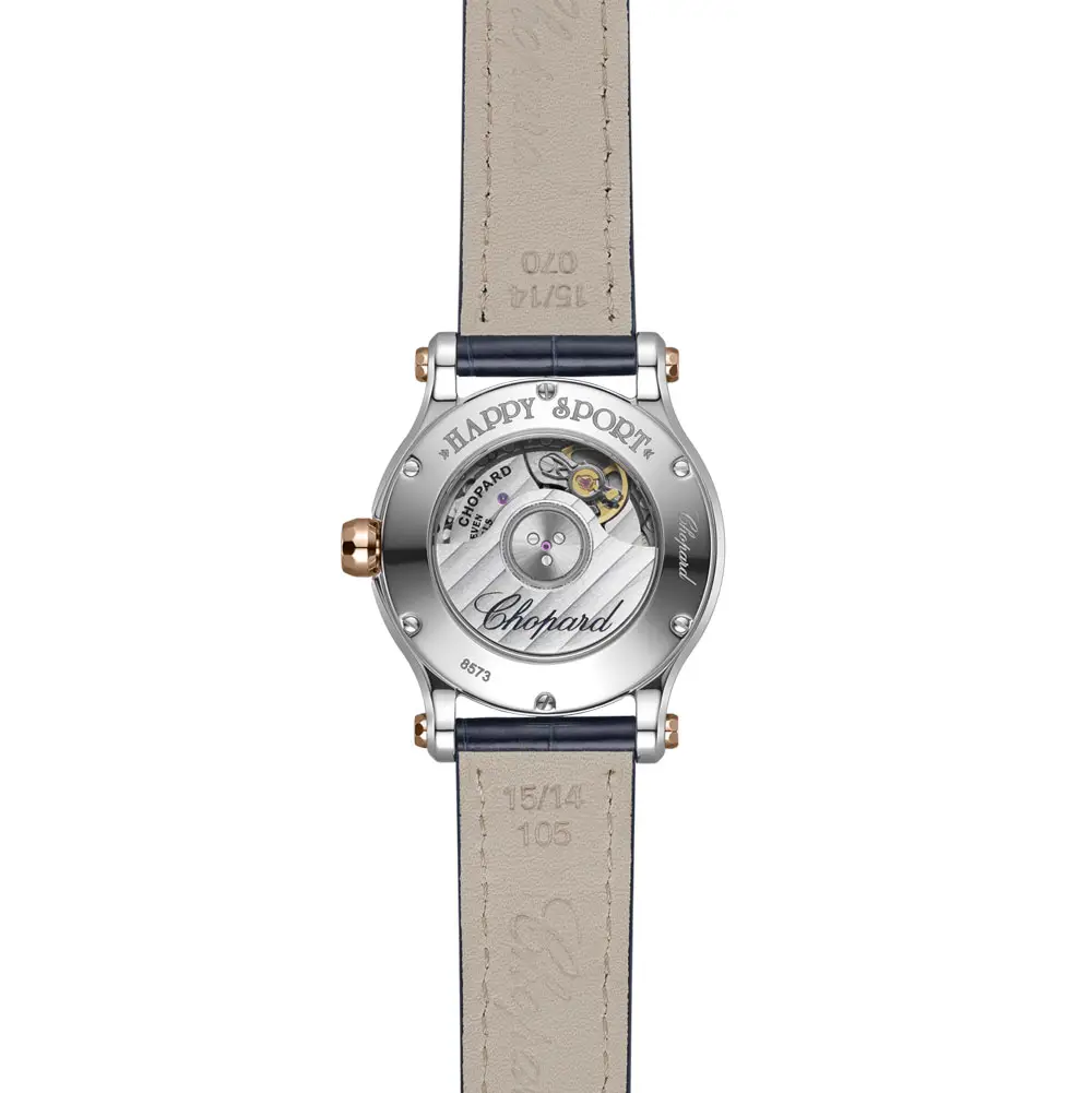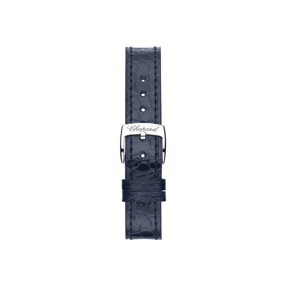Kompozici doplňuje modrý řemínek z aligátoří kůže s klasickou trnovou sponou, který podtrhuje hloubku a eleganci designu. Uvnitř tiká švýcarský automatický strojek, zaručující plynulý a přesný chod. Chopard Happy Sport Sun, Moon and Stars 278573-6027 nejsou jen hodinky – jsou šperkem inspirovaným vesmírem, který přináší poezii, světlo a nekonečnou eleganci do každého okamžiku.