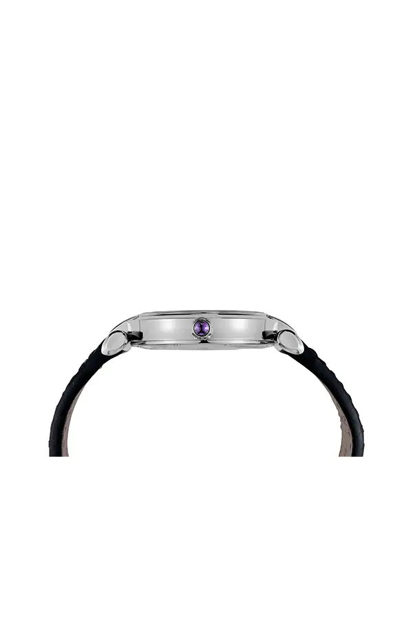Pouzdro o průměru 36 mm je vyrobeno z lesklé nerezové oceli, která zvýrazňuje čisté linie celého designu. Pod safírovým sklíčkem se rozprostírá perleťový ciferník s jemnými rytinami a římskými číslicemi na hlavních pozicích. Na korunce září ametystový kabošon, charakteristický pro kolekci Imperiale, dodávající modelu špetku královské noblesy.